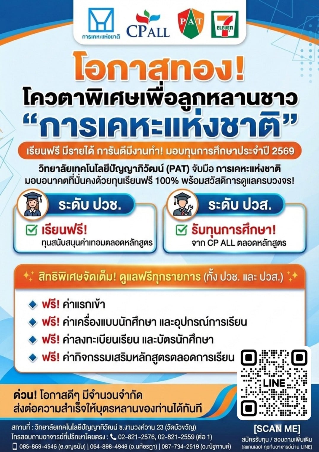 การเคหะแห่งชาติ หนุนการศึกษาเยาวชนจับมือ CP ALL และวิทยาลัยเทคโนโลยีปัญญาภิวัฒน์ มอบทุนการศึกษาหลักสูตร ปวช. และ ปวส. ประจำปีการศึกษา 2569 ให้แก่เยาวชนในชุมชนการเคหะแห่งชาติได้เรียนฟรีตลอดหลักสูตร พร้อมสวัสดิการมีรายได้ระหว่างเรียน สร้างโอกาสสู่การมีงานทำและอนาคตที่มั่นคง