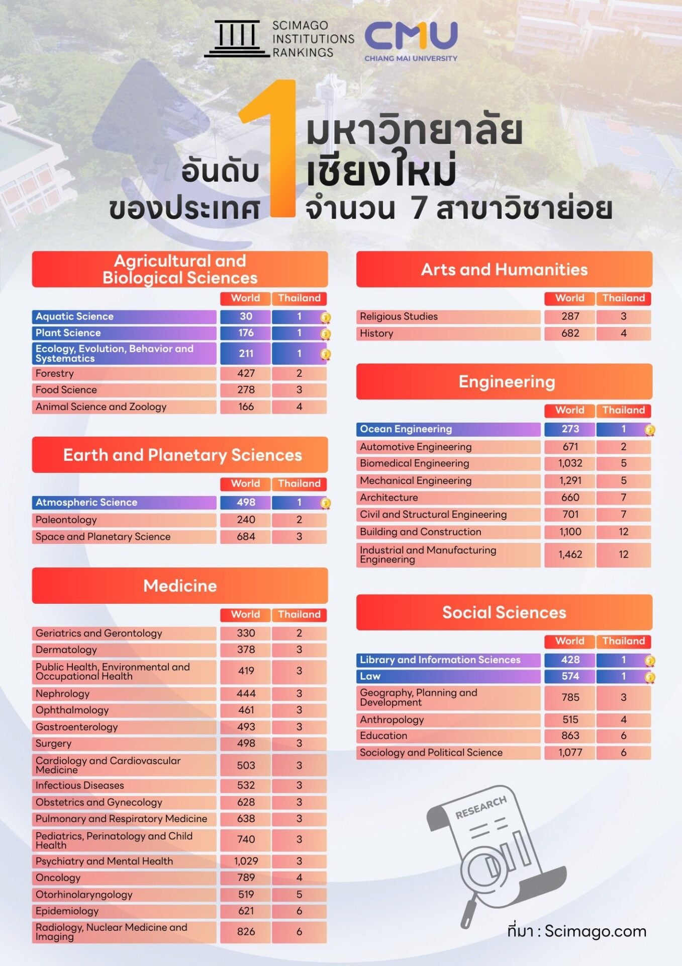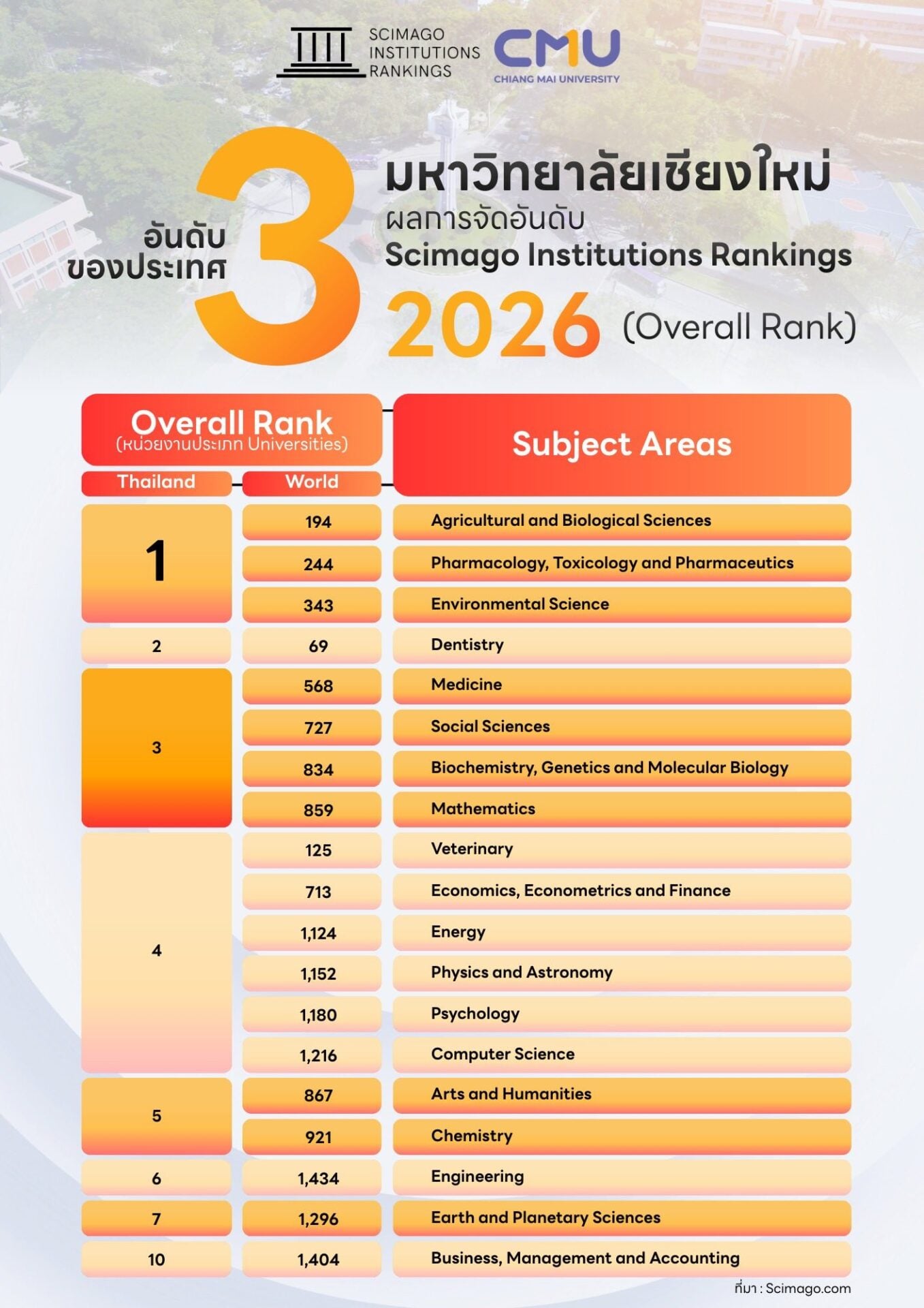 มหาวิทยาลัยเชียงใหม่ตอกย้ำความเป็นผู้นำด้านวิชาการของประเทศ ด้วยการคว้า อันดับ 1 ของประเทศไทยใน 7 สาขาวิชาย่อย จากการจัดอันดับ SCImago Institutions Rankings (SIR) 2026 พร้อมทั้งติดอันดับ 3 ของประเทศ และอันดับที่ 2,077 ของโลก ในกลุ่มสถาบันอุดมศึกษา จากมหาวิทยาลัยไทยที่ได้รับการจัดอันดับทั้งหมด 42 แห่ง สะท้อนศักยภาพด้านงานวิจัยและความเป็นมหาวิทยาลัยวิจัยชั้นนำในระดับสากล