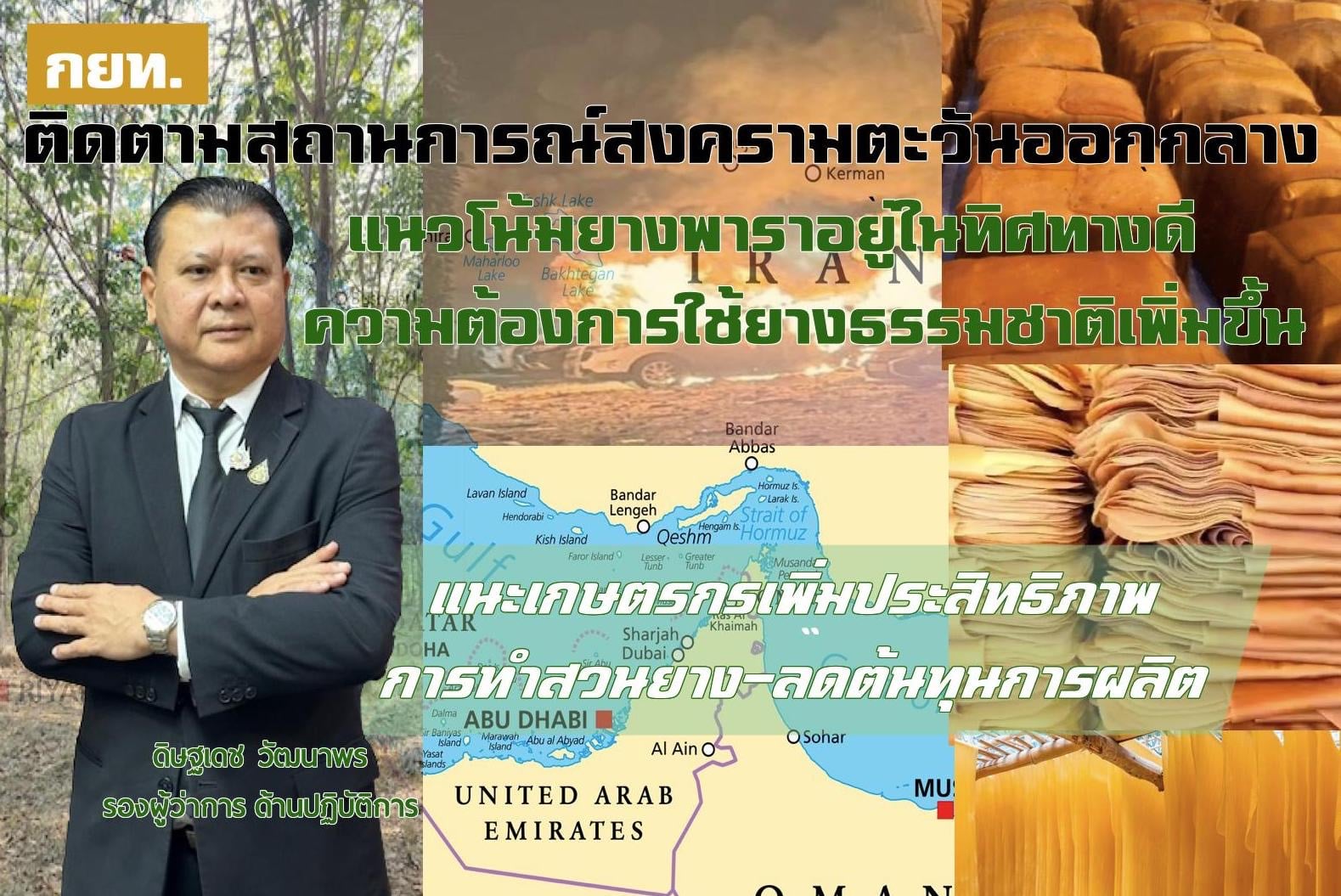 "สถานการณ์ในตะวันออกกลางอาจส่งผลให้ต้นทุนด้านโลจิสติกส์และพลังงานปรับตัวสูงขึ้นในบางช่วง อาจกระทบต่อต้นทุนการผลิตภาคการเกษตร โดยเฉพาะปุ๋ยเคมีที่จะต้องนำเข้าจากต่างประเทศ ซึ่ง กยท. ยังคงติดตามสถานการณ์อย่างใกล้ชิด เพื่อเตรียมมาตรการดูแลเกษตรกรชาวสวนยางอย่างต่อเนื่อง อย่างไรก็ตาม ในสภาวะเช่นนี้ กยท. ขอแนะนำให้พี่น้องชาวสวนยางให้ความสำคัญกับการเพิ่มผลผลิตต่อไร่ ลดต้นทุนการผลิต และบริหารจัดการสวนยางให้มีประสิทธิภาพ ควบคู่ไปกับการวางแนวทางเสริมรายได้โดยการทำอาชีพเสริมในสวนยาง เพื่อสร้างความมั่นคงในระยะยาว ทั้งนี้ กยท. พร้อมที่จะส่งเสริมและให้คำแนะนำที่ถูกต้องเหมาะสมแก่พี่น้องชาวสวนยางในทุกพื้นที่ โดยสามารถขอคำปรึกษาและสอบถามข้อมูลได้ที่ กยท. ทั่วประเทศใกล้บ้านท่าน" นายดิษฐเดช กล่าว
