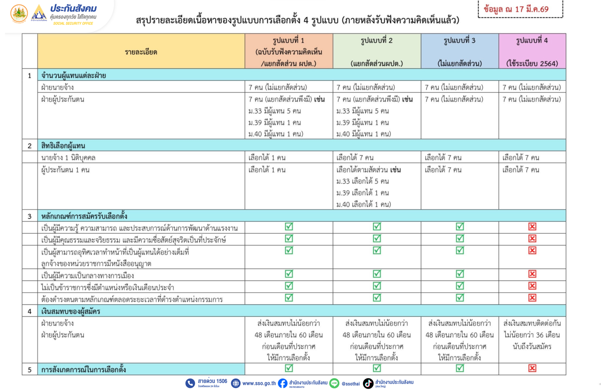 ทั้งนี้ รูปแบบที่ 1 และ 2 ให้ความสำคัญกับการแบ่งสัดส่วนผู้ประกันตนเพื่อให้เกิดการมีส่วนร่วมอย่างแท้จริง ในขณะที่รูปแบบที่ 3 และ 4 ไม่มีการแยกสัดส่วนโดยร่างระเบียบเลือกตั้งฉบับใหม่ (ในรูปแบบที่มีการปรับปรุง) ตามรูปแบบ (1) ได้กำหนดคุณสมบัติของผู้สมัครรับเลือกตั้งเพิ่มเติม เพื่อยกระดับความเชื่อมั่นที่มีต่อองค์กร อาทิ การมีความรู้ความสามารถหรือประสบการณ์ที่เกี่ยวข้อง มีคุณธรรมและความซื่อสัตย์สุจริต สามารถปฏิบัติหน้าที่ได้อย่างเต็มที่ และมีความเป็นกลางทางการเมือง รวมถึงกำหนดเงื่อนไขการส่งเงินสมทบไม่น้อยกว่า 48 เดือนในช่วง 60 เดือนก่อนการเลือกตั้ง และกำหนดให้มีการสังเกตการณ์ในการเลือกตั้งเพื่อเสริมสร้างความโปร่งใส