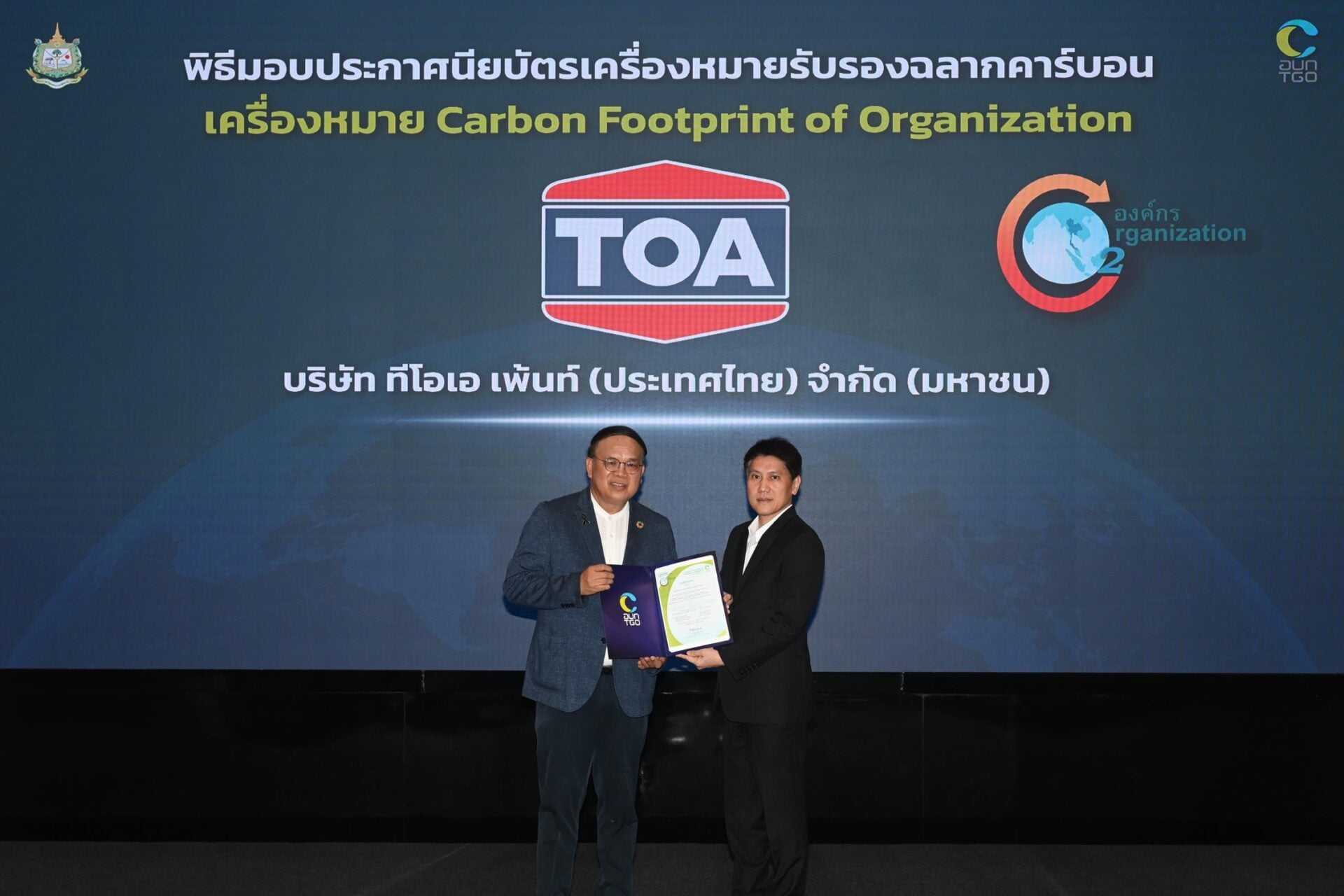 บริษัท ทีโอเอ เพ้นท์ (ประเทศไทย) จำกัด (มหาชน) หรือ TOA ผู้นำอุตสาหกรรมสีอันดับ 1 เคมีภัณฑ์ก่อสร้าง และวัสดุตกแต่งพื้นผิวของไทย ตอกย้ำความสำเร็จอย่างต่อเนื่องในการดำเนินธุรกิจควบคู่กับการดูแลสิ่งแวดล้อม เดินหน้าองค์กร Net Zero อย่างเป็นรูปธรรม ล่าสุดได้รับประกาศนียบัตร ‘การรับรองคาร์บอนฟุตพริ้นท์ขององค์กร (Carbon Footprint for Organization: CFO)’ โดยมี นายจตุภัทร์ ตั้งคารวคุณ ประธานเจ้าหน้าที่บริหาร TOA เข้ารับมอบประกาศนียบัตรจาก ดร.วิจารย์ สิมาฉายา ประธานกรรมการองค์การบริหารจัดการก๊าซเรือนกระจก (องค์การมหาชน) หรือ อบก. และมี นายณกรณ์ ตรรกวิรพัท ผู้อำนวยการ อบก. ร่วมแสดงความยินดี ณ สถาบันเพื่อการยุติธรรมแห่งประเทศไทย หรือ TIJ