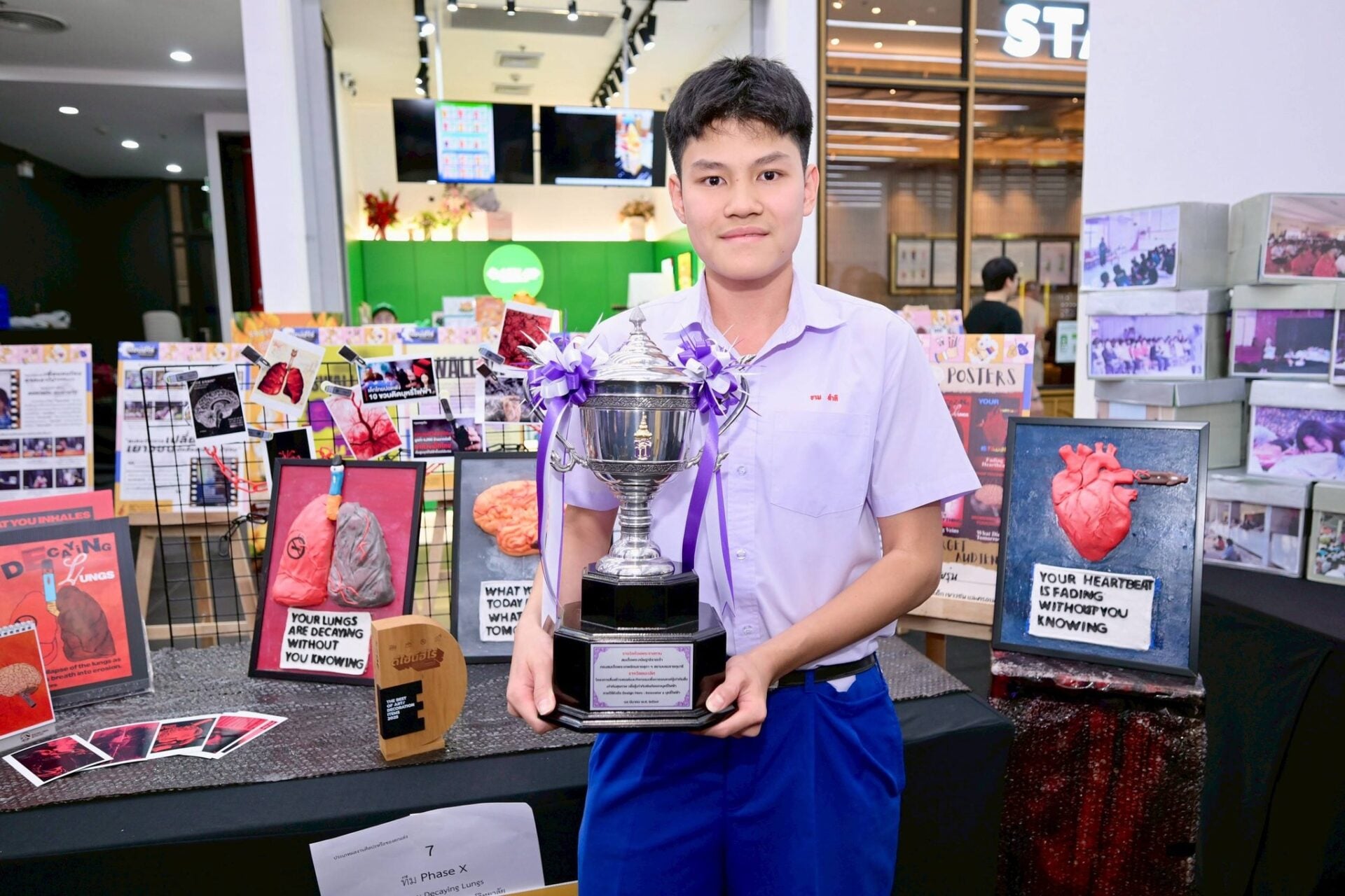 ผลงานที่ได้รับถ้วยพระราชทานมาจากทีม Phase X โรงเรียนปรินส์รอแยลส์วิทยาลัย จ.เชียงใหม่ นำโดย “ธาม ทำดี” นักเรียน ม.4 กับผลงาน “Decaying Lungs” งานศิลปะในกรอบรูปที่ปั้นอวัยวะสำคัญจากดินเยื่อกระดาษ สื่อถึงความเสื่อมสลายของร่างกายจากบุหรี่ไฟฟ้า และต่อยอดเป็นสื่อปฏิทินใช้ในห้องเรียนได้จริง