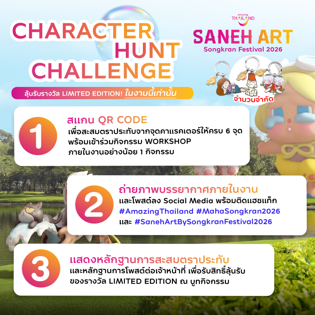 ภายในงานยังมีกิจกรรมส่งเสริมการมีส่วนร่วมของนักท่องเที่ยว “Character Hunt Challenge” เพื่อกระตุ้นการเข้าร่วมกิจกรรมและสร้างการรับรู้ผ่านสื่อสังคมออนไลน์ ผู้เข้าร่วมกิจกรรมสแกน QR Code เพื่อสะสมตราประทับ (Stamp) จากจุดคาแรคเตอร์ให้ครบจำนวน 6 จุด เข้าร่วมกิจกรรมภายในงานอย่างน้อย 1 กิจกรรม ถ่ายภาพภายในงานและเผยแพร่ผ่านสื่อสังคมออนไลน์ พร้อมติดแฮชแท็ก #AmazingThailand #MahaSongkran2026 และ #SanehArtBySongkranFestival2026 แสดงหลักฐานการเข้าร่วมกิจกรรม การสะสมตราประทับ และการเผยแพร่ผ่านสื่อสังคมออนไลน์ ต่อเจ้าหน้าที่ภายในพื้นที่จัดงานเพื่อตรวจสอบ ผู้ที่ปฏิบัติตามเงื่อนไขครบถ้วน จะได้รับสิทธิ์ร่วมลุ้นของรางวัล Limited Edition ที่ศิลปินออกแบบมีเฉพาะภายในพื้นที่จัดงาน