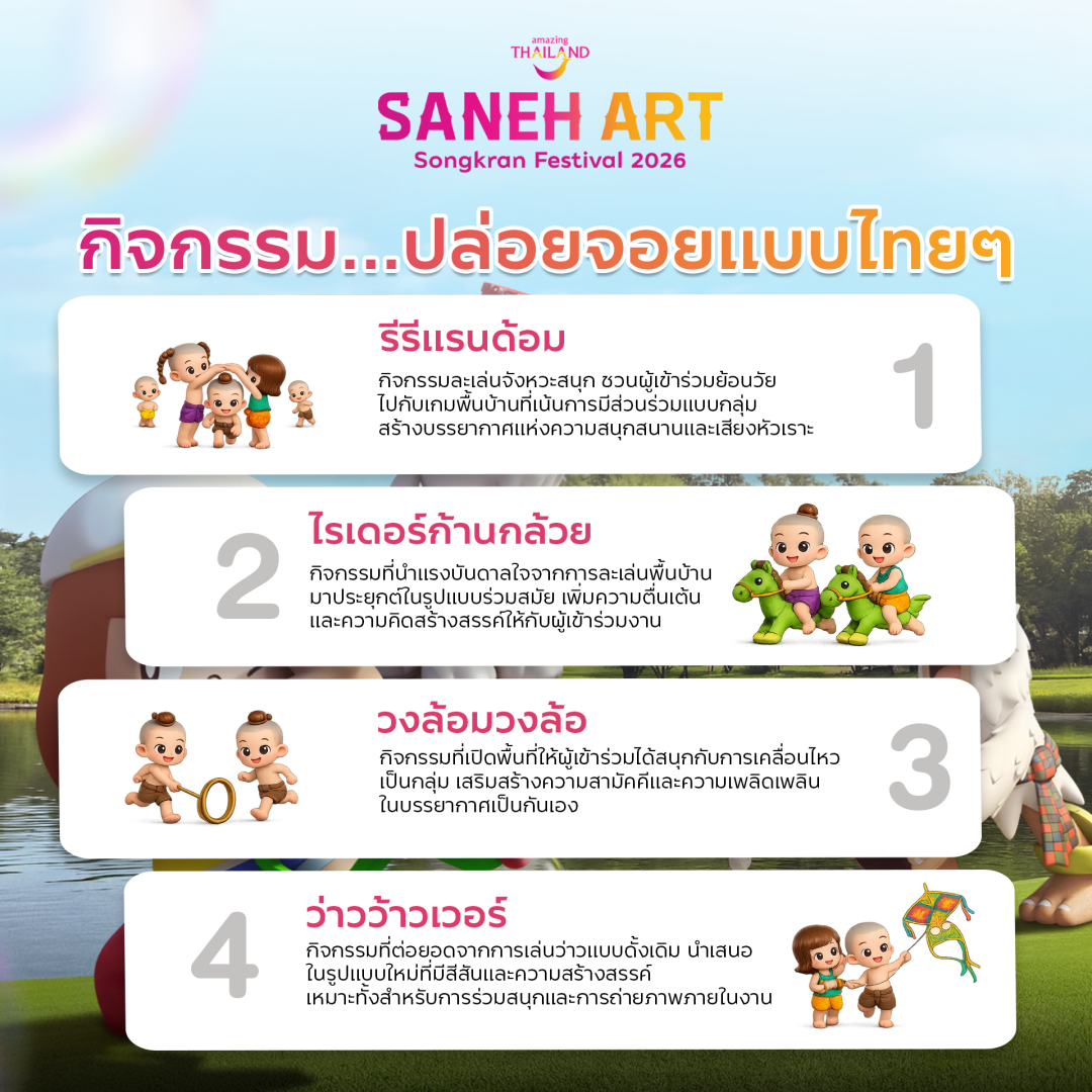 งาน #SanehArtBySongkran Festival2026” จัดขึ้นระหว่างวันที่ 11-15 เมษายน 69 เวลา10.00 20.00น