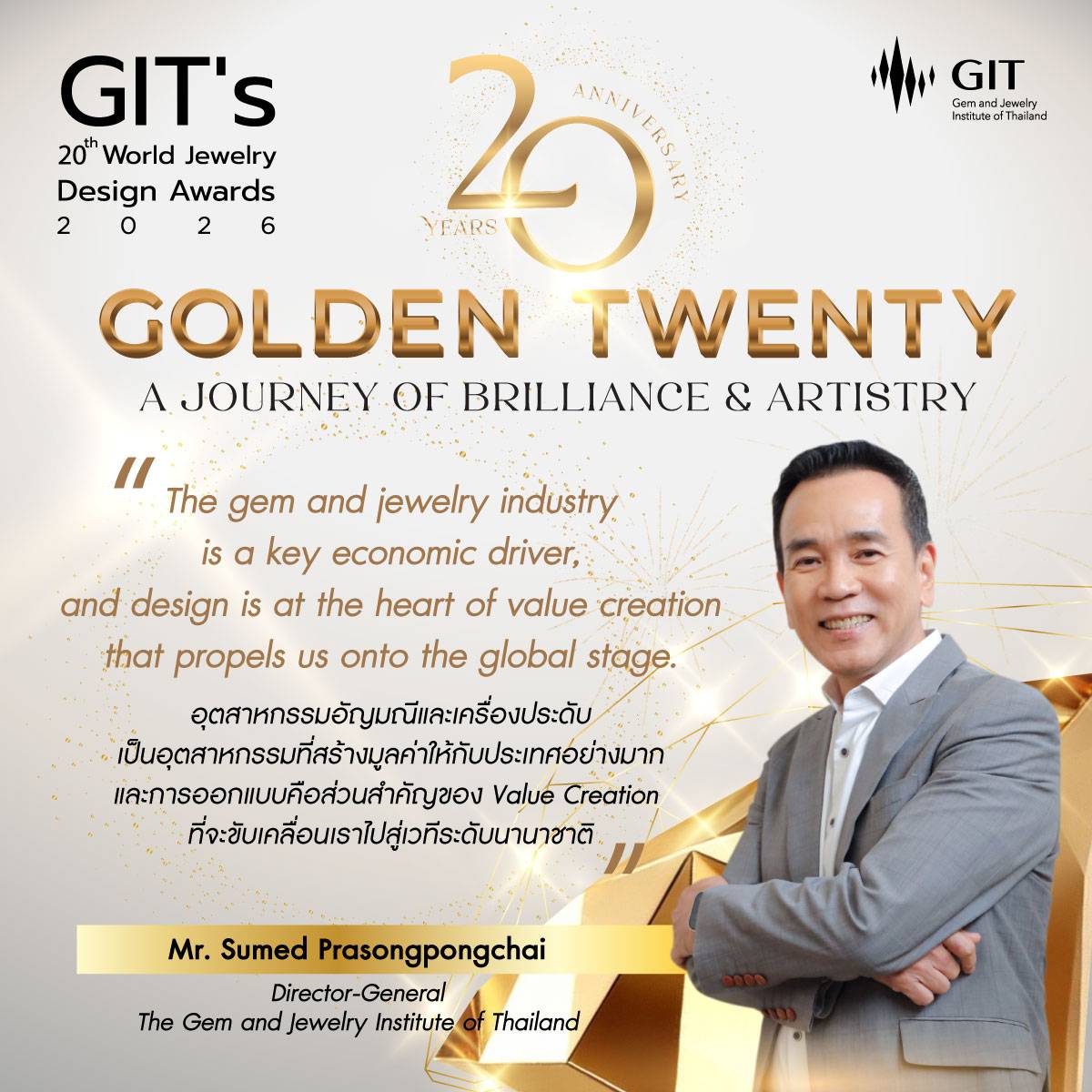 สถาบันวิจัยและพัฒนาอัญมณีและเครื่องประดับแห่งชาติ (องค์การมหาชน) หรือ GIT เดินหน้าสานต่อบทบาทสำคัญในการผลักดันอุตสาหกรรมอัญมณีและเครื่องประดับไทยสู่เวทีสากล ด้วยการจัด “การประกวดออกแบบเครื่องประดับระดับโลก ครั้งที่ 20” เนื่องในโอกาสครบรอบสองทศวรรษของโครงการ ภายใต้แนวคิด “Golden Twenty: A Journey of Brilliance and Artistry” ซึ่งสะท้อนการเดินทางแห่งความงดงาม ความคิดสร้างสรรค์ และความเชี่ยวชาญที่สั่งสมมาอย่างต่อเนื่อง