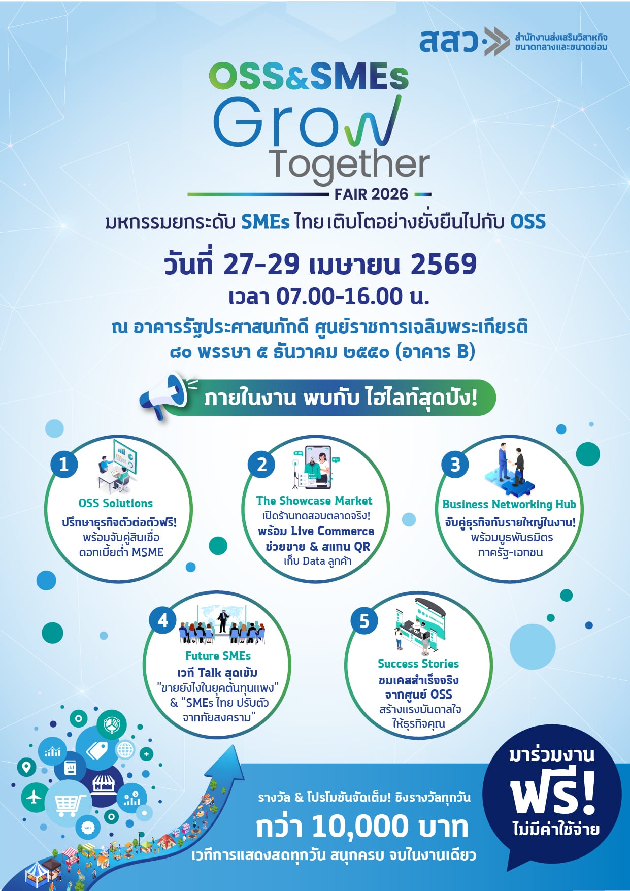 จึงขอเชิญชวนประชาชนทั่วไปเข้าร่วมชม ชิม ช้อป และให้กำลังใจผู้ประกอบการไทยได้ภายในงาน “OSS & SMEs GROW TOGETHER FAIR 2026” ระหว่างวันที่ 27–29 เมษายน 2569 ณ ศูนย์ราชการเฉลิมพระเกียรติฯ อาคารบี ถนนแจ้งวัฒนะ เข้าร่วมงานได้โดยไม่เสียค่าใช้จ่าย.