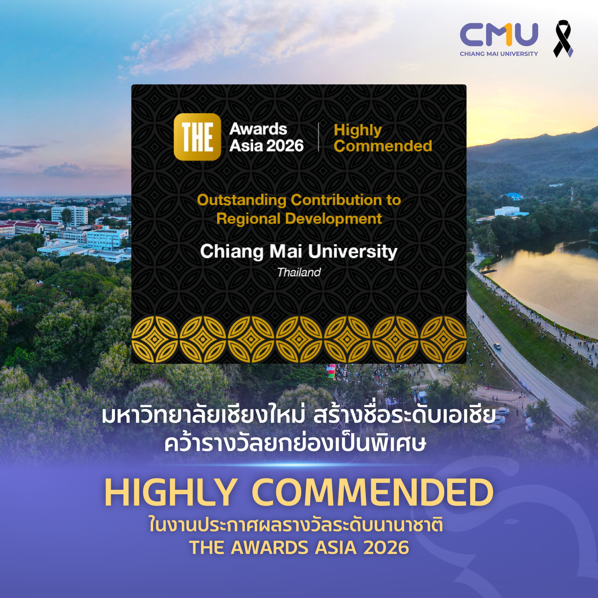 มช. พร้อมสร้างความภาคภูมิใจแก่ประเทศไทย เมื่อได้รับการยกย่องเป็น มหาวิทยาลัยไทยเพียงแห่งเดียวที่คว้ารางวัลระดับ Highly Commended จากเวทีระดับนานาชาติ Times Higher Education (THE) Awards Asia 2026 ในหมวด Outstanding Contribution to Regional Development
