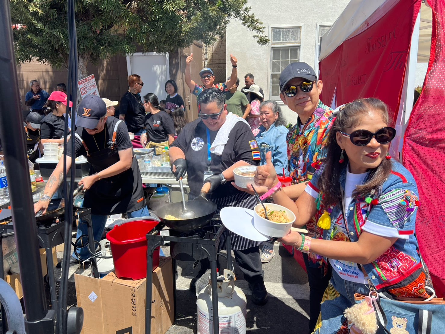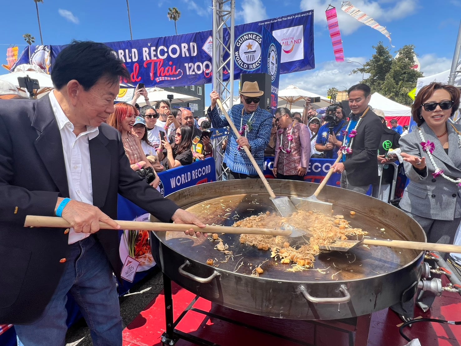 ส่วนบรรยากาศในงานมีพิธีเปิดงานอย่างเป็นทางการ เวลา 13.00 น. ที่เวทีใหญ่ โดยมีนายต่อ ศรลัมพ์ กงสุลใหญ่ ณ นครลอสแอนเจลิศ นางคาเรน บาสส์ นายกเทศมนครีนครลอสแอนเจลิส นางมาเรีย อีเมนา ดูราโซ สมาชิกวุฒิสภาเขตฮอลลีวูด พร้อมบุคคลต่างๆ เข้าร่วมงาน และที่สร้างความฮือฮาเป็นไฮไลท์ไม่น้อยหน้ากันคือ การผัดไทยกระทะยักษ์ ที่เชิญคุณหญิงสุดารัตน์ เกยุราพันธ์ อดีต รมว.สาธารณสุข, นายสมใจนึก เองตระกูล อดีตปลัดกระทรวงการคลัง, นายพิธา ลิ้มเจริญรัตน์ อดีตหัวหน้าพรรคก้าวไกล, นายต่อ ศรลัมพ์ กงสุลใหญ่ ณ นครลอสแอนเจลิส, นายนภดล วงศ์ชัยวัฒน์ ประธานไทยนิวเยียร์ฯ นายสัณณ์ชัย เองตระกูล หรือเป็ก ประธานจัดงานฝ่ายประเทศไทย และนักการเมืองอเมริกันมาร่วมผัดด้วย ก่อนจะมีการแข่งขันผัดไทยในสไตล์ต่างๆ ของเชฟ