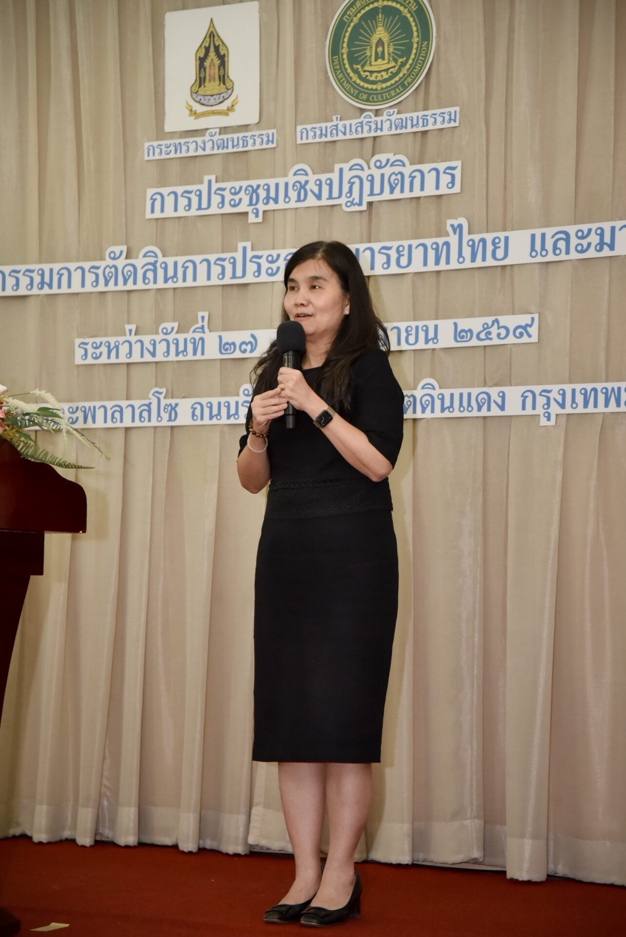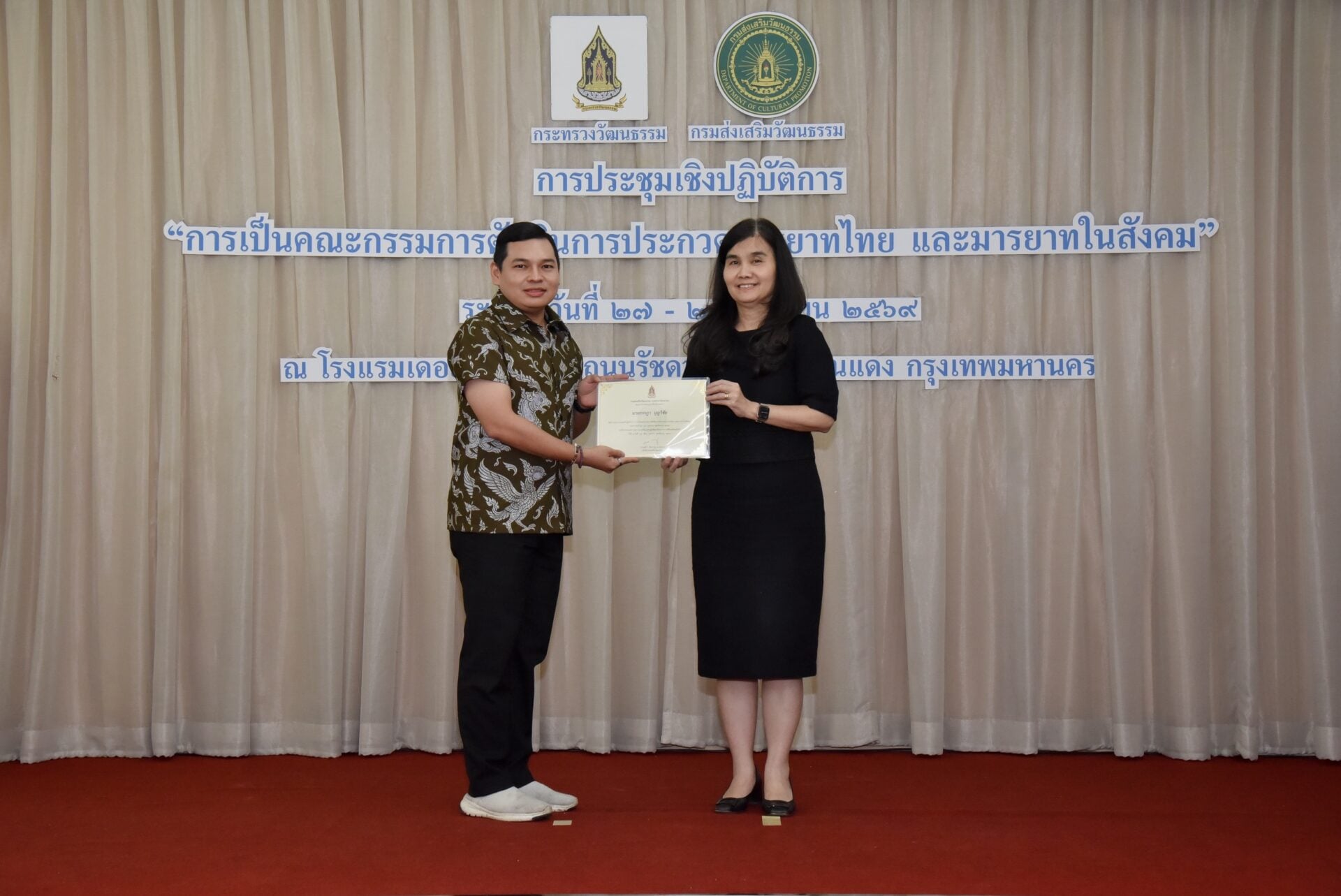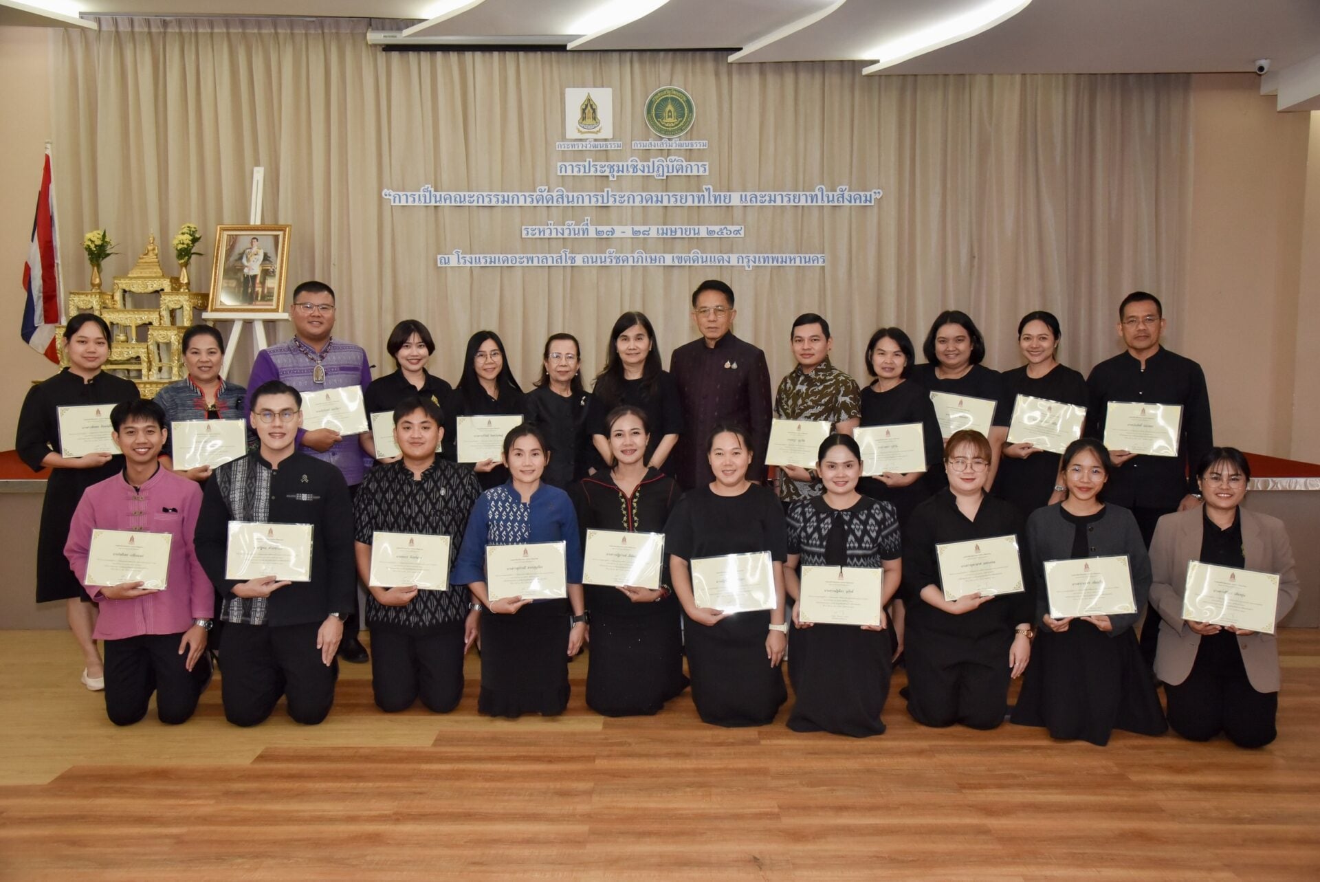วันที่ 28 เมษายน 2569 เวลา 15.00 น. นางยุถิกา อิศรางกูร ณ อยุธยา อธิบดีกรมส่งเสริมวัฒนธรรม เป็นประธานในพิธีมอบเกียรติบัตร พร้อมกล่าวแสดงความยินดีและให้โอวาทแก่ผู้ผ่านการประชุมเชิงปฏิบัติการ “การเป็นคณะกรรมการตัดสินการประกวดมารยาทไทย และมารยาทในสังคม” โดยมีนายบันเทิง เพียรค้า ผู้อำนวยการกลุ่มค่านิยมและความเป็นไทย รักษาราชการแทนผู้อำนวยการสถาบันวัฒนธรรมศึกษา พร้อมด้วยวิทยากร 4 คน ได้แก่ นางสาวจุฑามาศ ใหญ่คุ้ม นายวินัย วรวัตร์ นางสาวจันทนา บุญบรรดาล และนางมงคลทิพย์ รุ่งงามฤกษ์ ตลอดจนผู้เข้าร่วมประชุมจากสำนักงานวัฒนธรรมจังหวัดทั้ง 76 จังหวัดทั่วประเทศ และบุคลากรกรมส่งเสริมวัฒนธรรม เข้าร่วม ณ โรงแรมเดอะพาลาสโซ ถนนรัชดาภิเษก เขตดินแดง กรุงเทพมหานคร