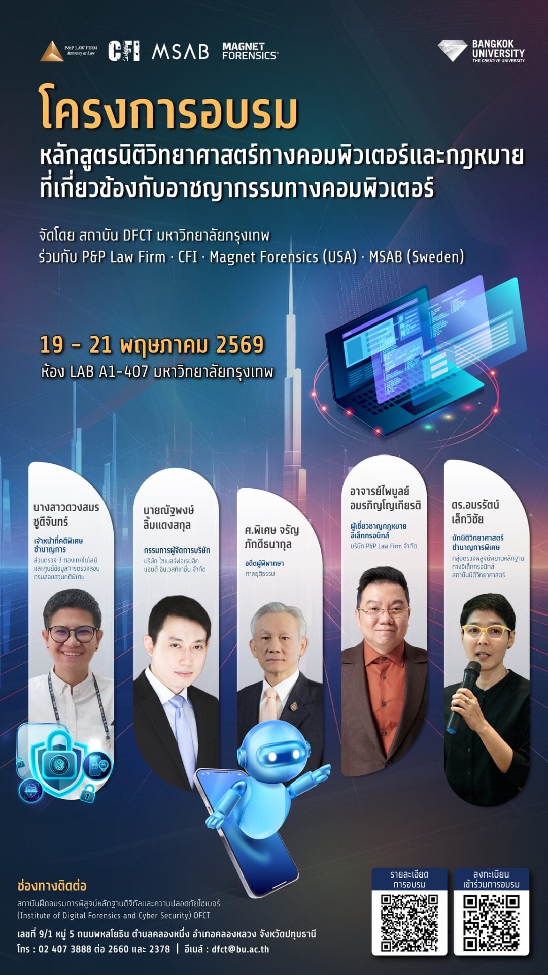 สถาบัน DFCT มหาวิทยาลัยกรุงเทพ เปิดอบรมหลักสูตรนิติวิทยาศาสตร์ทางคอมพิวเตอร์ โดยร่วมมือกับบริษัทชั้นนำระดับโลก อย่าง Magnet Forensics & MSAB ยกระดับทักษะสาย Tech & Law สู่มาตรฐานสากล ให้พร้อมรับมือกับภัยคุกคามทางไซเบอร์และอาชญากรรมดิจิทัลในยุคปัจจุบัน