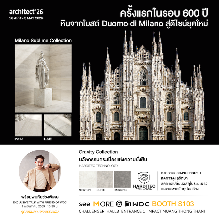 สำหรับการเข้าร่วมงานสถาปนิก’69 ปีนี้ WDC ได้นำเสนอคอลเลกชันและนวัตกรรมใหม่เพื่อตอบโจทย์ทั้งด้านดีไซน์ เทคโนโลยี และคุณภาพชีวิตของผู้ใช้งาน โดยมีไฮไลต์สำคัญ ดังนี้ MILANO SUBLIME Collection : คอลเลกชันระดับพรีเมียมที่สะท้อนความงามเชิงสถาปัตยกรรมระดับโลก โดยนับเป็นครั้งแรกในรอบกว่า 600 ปี ที่ลวดลายหินจากมหาวิหาร Duomo di Milano กรุงมิลาน ประเทศอิตาลี ได้รับอนุญาตให้นำมาถอดแบบอย่างถูกต้อง ผ่านกระบวนการสแกนพื้นผิวต้นแบบอย่างละเอียดก่อนพัฒนาเป็นกระเบื้องพอร์ซเลนระดับพรีเมียมสำหรับงานสถาปัตยกรรมร่วมสมัย ทั้งนี้ รายได้ส่วนหนึ่งจากการจำหน่ายจะนำกลับไปสนับสนุนมูลนิธิผู้ดูแลมหาวิหารแห่งนี้