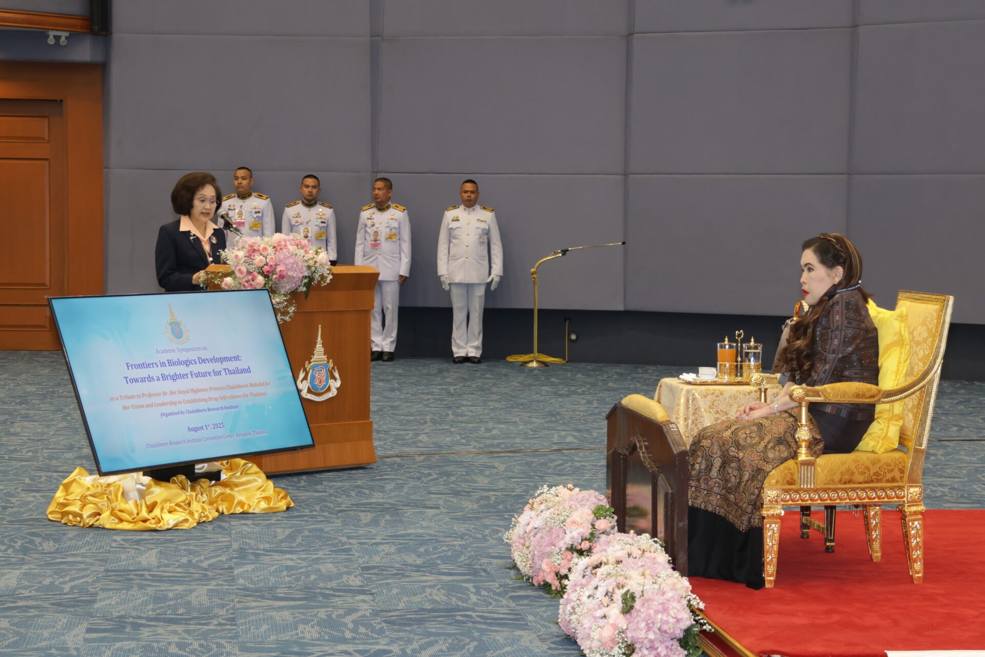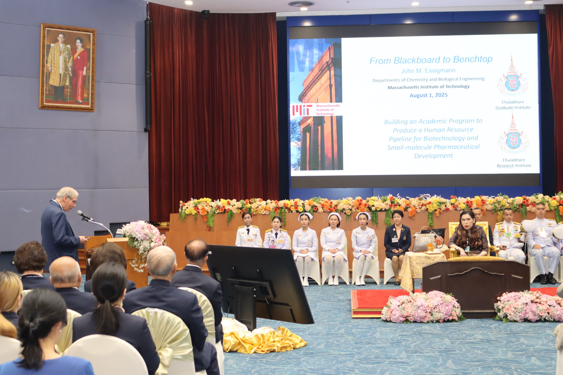 จากนั้น ทรงรับฟังปาฐกถาเฉลิมพระเกียรติฯ โดยศาสตราจารย์ ราม ซาซิเซคาราน (Professor Ram Sasisekharan) จากสถาบันเทคโนโลยีแห่งแมสซาซูเซตส์ สหรัฐอเมริกา (Massachusetts Institute of Technology -MIT), USA ในหัวข้อเรื่อง “สดุดีพระเกียรติคุณ ศาสตราจารย์ ดร. สมเด็จพระเจ้าน้องนางเธอ เจ้าฟ้าจุฬาภรณวลัยลักษณ์ฯ: บทบาทของประเทศไทยในยุคที่ยาชีววัตถุมีความสำคัญระดับโลก” (A Tribute to Her Royal Highness Princess Chulabhorn Mahidol: Thailand’s Role in the Global Biologics Era) ต่อจากนั้น ทรงรับฟังการบรรยายพิเศษในหัวข้อเรื่อง “จากการเรียนการสอนสู่ห้องปฏิบัติการ: จุดเริ่มต้นของยาชีววัตถุในประเทศไทย” (From Blackboard to Benchside: The Origin of Biologics in Thailand) โดยศาสตราจารย์ จอห์น เอ็ม เอสซิกแมน (Professor John M. Essigmann) จากสถาบันเทคโนโลยีแห่งแมสซาชูเซตส์ สหรัฐอเมริกา (Massachusetts Institute of Technology -MIT), USA ซึ่งสดุดีพระปรีชาสามารถในการวางรากฐานการพัฒนายาควบคู่ไปกับการพัฒนาบุคลากรให้ประเทศ