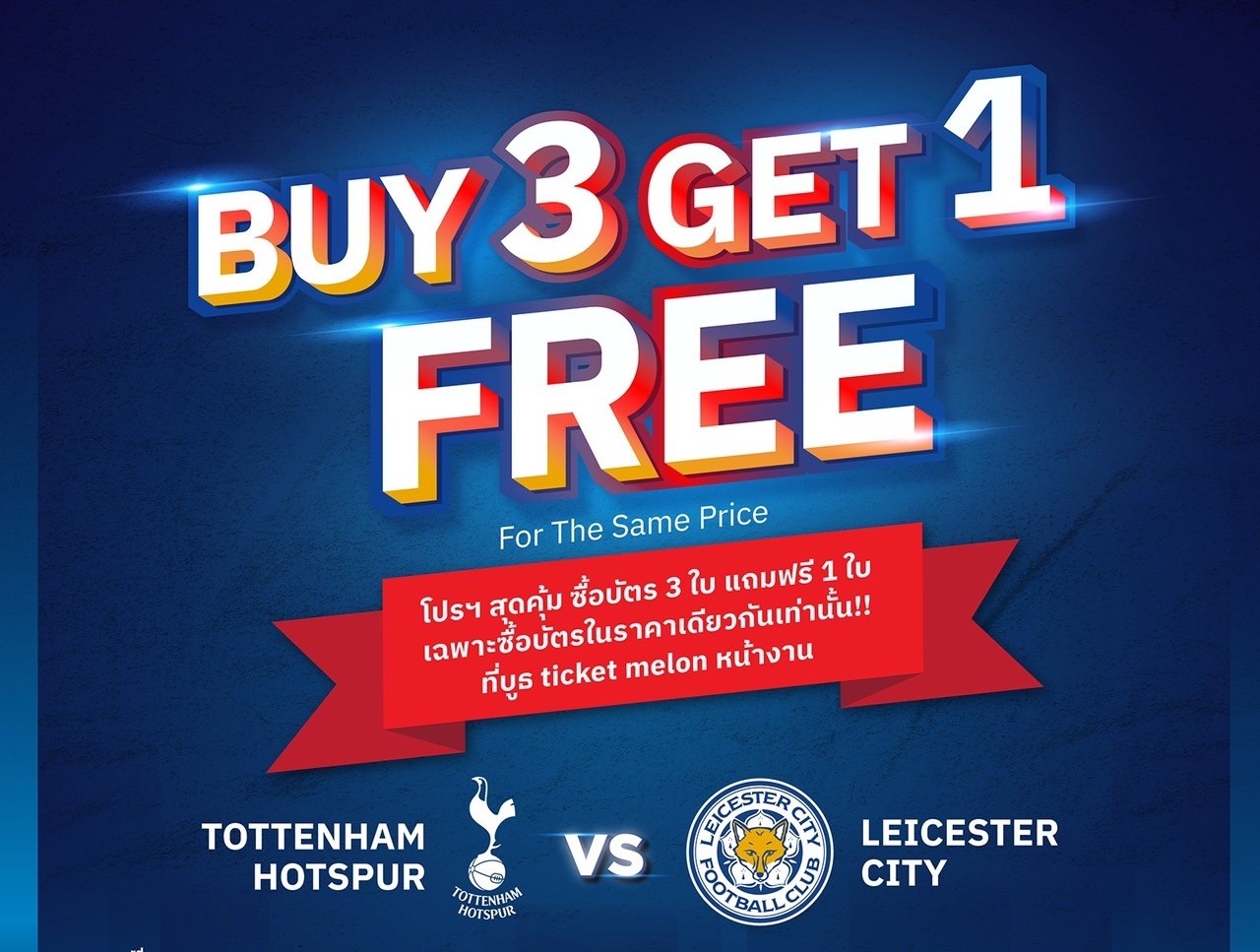 ‘ProEvents’ และ ‘TEG Sport’ ผู้จัดการแข่งขันปล่อยโปรฯ สุดพิเศษเพียงซื้อบัตรเข้าชมการแข่งขันฟุตบอลนัดอุ่นเครื่องรายการพิเศษ ‘เลสเตอร์ ซิตี้’พบกับ ‘ท็อตแน่ม ฮ็อทสเปอร์’ในวันนี้ อาทิตย์ที่ 23 กรกฏาคม 2566เวลา 17.00 น. ที่ราชมังคลากีฬาสถาน (หัวหมาก) บริเวณจุดขายบัตรหน้างาน จำนวน 3 ใบ แถมฟรีทันที 1 ใบ (ในราคาเดียวกัน)