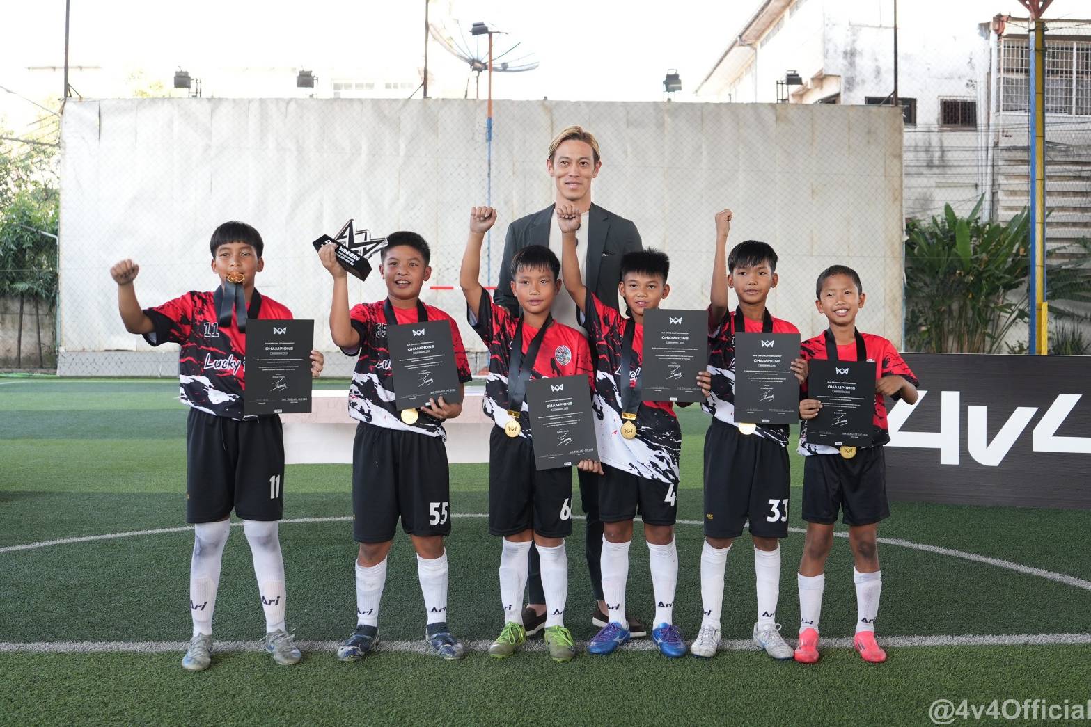 ตำนานลูกหนังแดนซามูไร “เคสุเกะ ฮอนดะ” ยกนิ้วให้เด็กไทย พัฒนาการเล่นฟุตบอลรูปแบบใหม่ 4V4 ที่ตัวเองนำมาเผยแพร่ไปทั่วเอเชีย ได้อย่างรวดเร็ว โดยล่าสุดจัดบอลเยาวชน 4 คนชิงแชมป์ประเทศไทย ตำแหน่งชนะเลิศตกเป็นของแข้งจิ๋วจากทีม Lucky Boys ที่ซิวตั๋วเป็นตัวแทนประเทศไทย ไปบู๊ศึกลูกหนังชิงแชมป์เอเชีย 4V4 Asian Cup ที่ประเทศญี่ปุ่น ในเดือน ส.ค.นี้ โดยจะมี 12 ชาติร่วมโม่เกือก