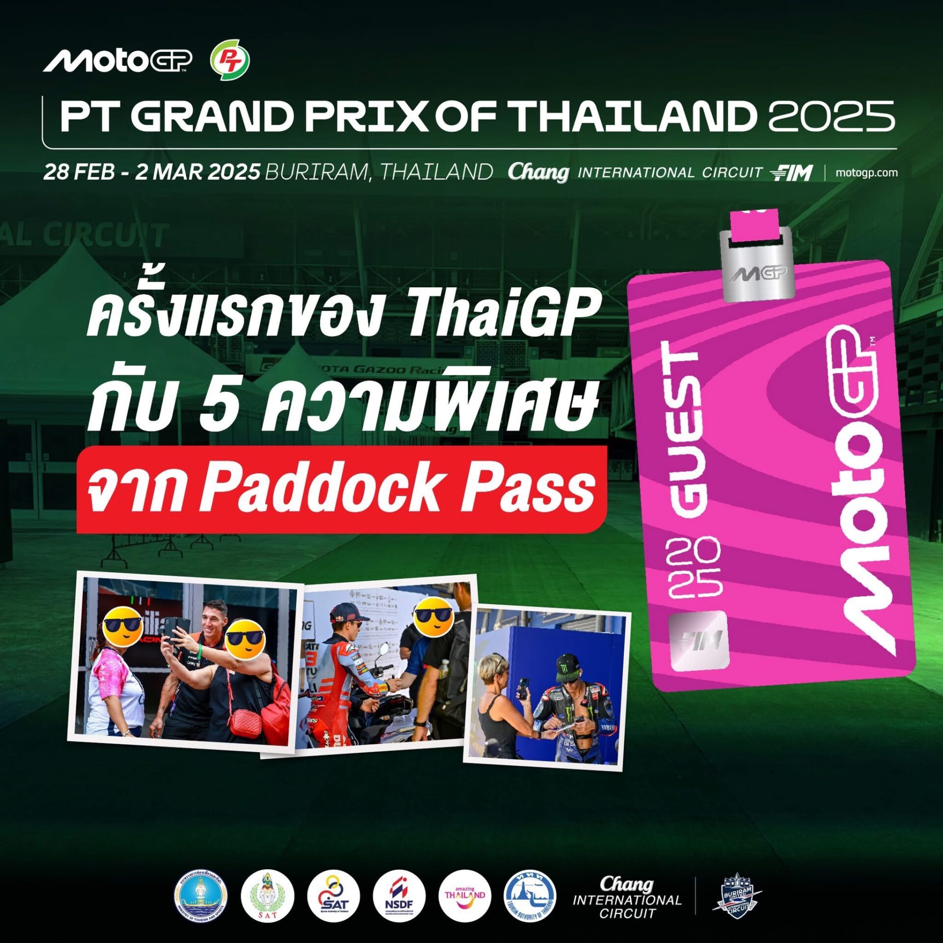 Paddock Pass ไทยจีพี ที่แฟนโมโตจีพี ต้องห้ามพลาด กับการแข่งขันโมโตจีพี สนามเปิดฤดูกาล 2025 ที่ประเทศไทยรายการ "พีที กรังด์ปรีซ์ ออฟ ไทยแลนด์ 2025" วันที่ 28 กุมภาพันธ์-2 มีนาคม 2568 ณ สนามช้างฯ จังหวัดบุรีรัมย์