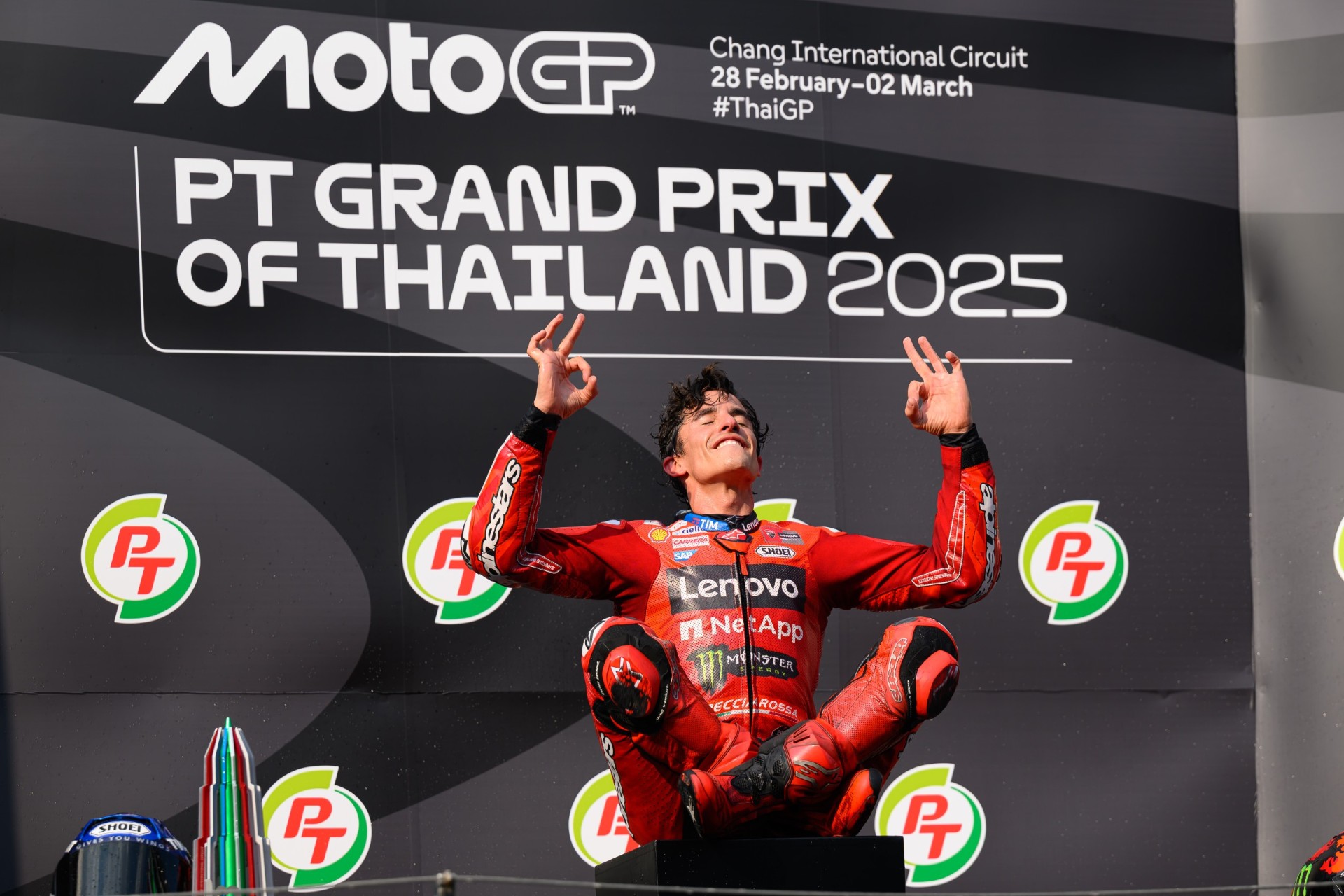 ศึก พีที กรังด์ปรีซ์​ออฟ ไทยแลนด์ 2025 ดวลความเร็วรอบ “เมนกรังด์ปรีซ์” เมื่อวันอาทิตย์ที่ 2 มีนาคมที่ผ่านมา ที่ สนามช้าง อินเตอร์เนชั่นแนล เซอร์กิต จ.บุรีรัมย์ โดยไฮไลต์ของการแข่งขันอยู่ที่การดวลฝีมือของสุดยอดนักบิดระดับแชมป์โลก นำโดย มาร์ค มาร์เกซ ยอดนักบิดสแปนิชจาก ดูคาติ เลอโนโว ทีม และทีมเมทชาวอิตาเลียนอย่าง ฟรานเชสโก้ บันยาญ่า,​ ฟาบิโอ กวาร์ตาราโร นักบิดเฟรนช์จาก มอนสเตอร์ อีเนอร์จี้ ยามาฮ่า โมโตจีพี, โจอัน เมียร์ นักบิดสแปนิชจาก ฮอนด้า เอชอาร์ซี คาสตรอล และนักบิดแถวหน้าของโลกอีกหลายคน