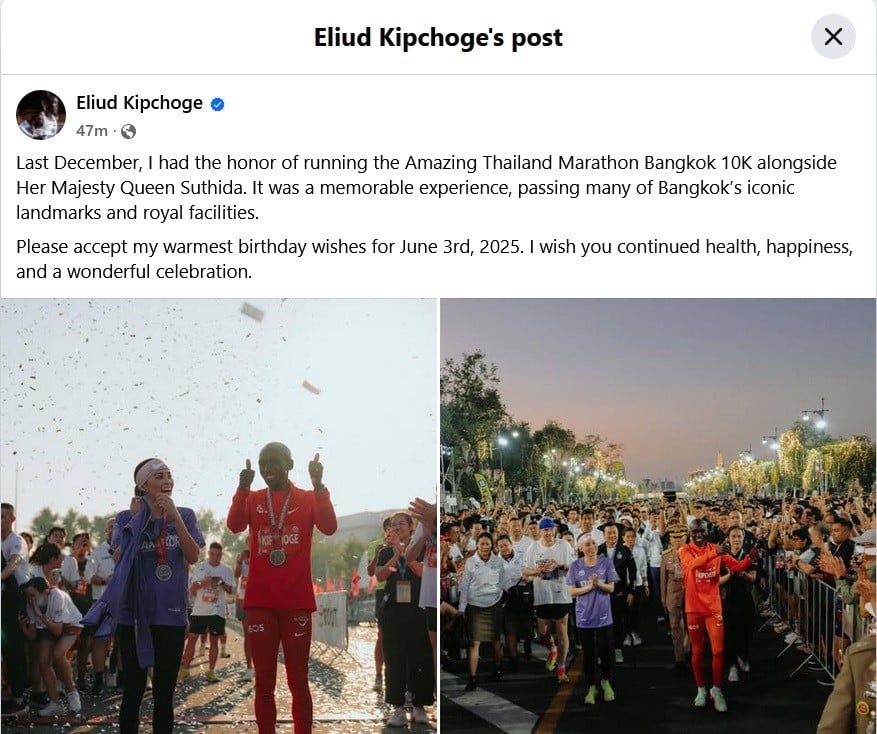 "เอเลียด คิปโชเก" ตำนานนักวิ่งมาราธอนโลก เจ้าของสถิติวิ่งมาราธอนได้ต่ำกว่า 2 ชม. และแชมป์โอลิมปิกเกมส์ 2 สมัยชาวเคนยา และฑูตด้านการท่องเที่ยวกีฬาและวัฒนธรรมของประเทศไทย ที่เมื่อปลายปีที่ผ่านมา เคยได้รับเกียรติให้เข้าร่วมวิ่งมาราธอน Amazing Thailand Bangkok 10K ร่วมกับสมเด็จพระนางเจ้าฯ พระบรมราชินี ได้โพสต์ถวายพระพร สมเด็จพระนางเจ้าฯ พระบรมราชินี เนื่องในโอกาสวันเฉลิมพระชนมพรรษา 3 มิถุนายน 2568