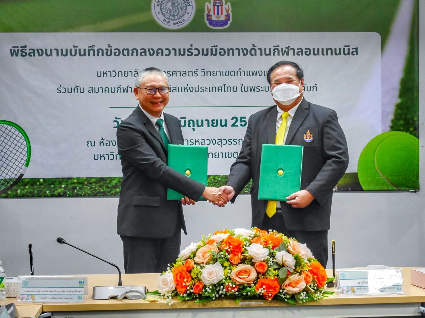 มหาวิทยาลัยเกษตรศาสตร์ วิทยาเขตกำแพงแสน โดย รองศาสตราจารย์ นายสัตวแพทย์ ดร.อนุชัย ภิญโญภูมิมินทร์ รองอธิการบดี ปฏิบัติหน้าที่แทน อธิการบดี ม.เกษตรศาสตร์ กับ สมาคมกีฬาลอนเทนนิสแห่งประเทศไทย ในพระบรมราชูปถัมภ์ โดย นายไทยทนุ วรรณสุข เลขาธิการสมาคมฯ ได้ร่วมกันทำบันทึกข้อตกลงความร่วมมือทางด้านกีฬา ณ ม.เกษตรศาสตร์ วิทยาเขตกำแพงแสน จ.นครปฐม เมื่อวันที่ 6 มิถุนายน 2568 ท่ามกลางบรรยากาศชื่นมื่น โดยมี ว่าที่ร้อยตรี ดร.ศิริชัย ศรีพรหม ผู้ช่วยอธิการบดีฝ่ายบริหาร กีฬา และศิลปวัฒนธรรม กล่าวรายงาน