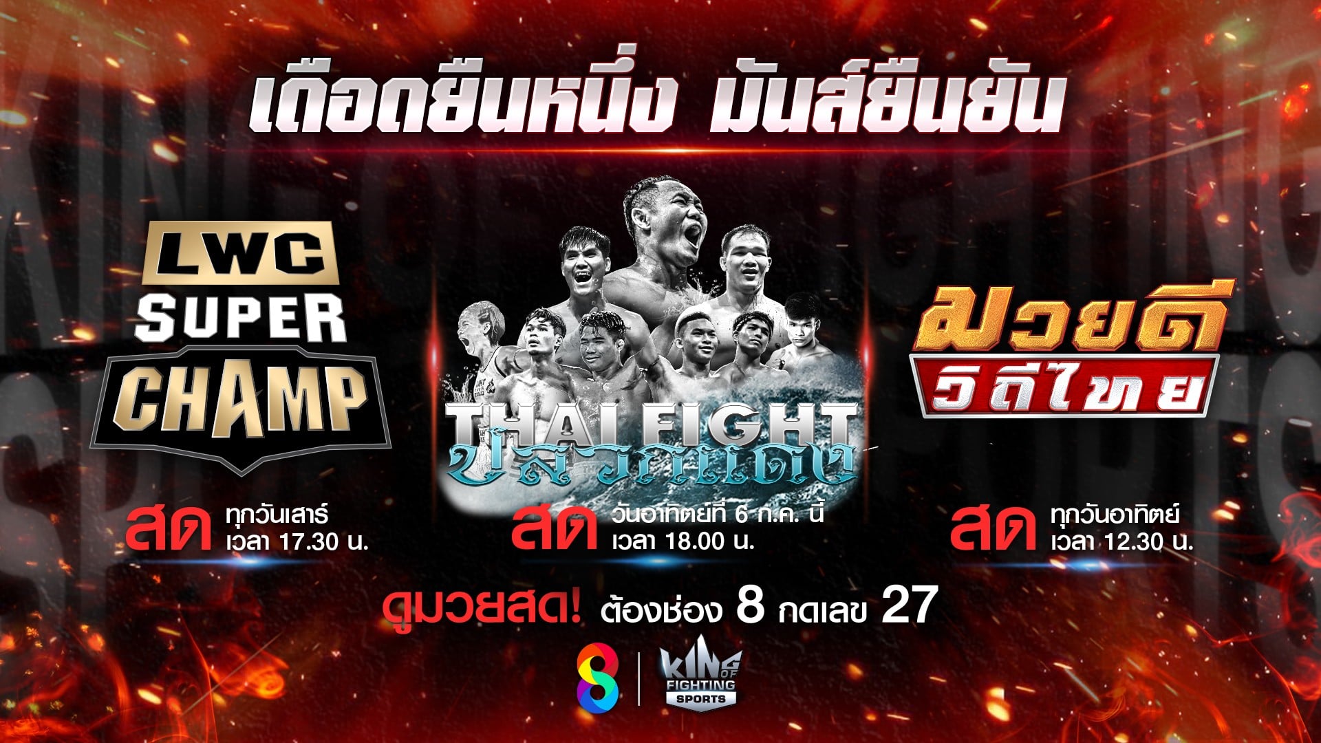 ดังนั้นห้ามพลาดชม 3 รายการมวยไทยสุดสัปดาห์ การันตีความมันส์ที่สุดระดับประเทศ ใน รายการ LWC SUPER CHAMP (ลุมพินีเวิลด์ แชมเปี้ยนชิพ ซุปเปอร์แชมป์) ในวันเสาร์ที่ 5 กรกฎาคม เวลา 17.30 น. และ วันอาทิตย์ที่ 6 กรกฎาคม กับ รายการ มวยดีวิถีไทย เวลา 12.30 น. พร้อมปิดท้าย รายการพิเศษ THAI FIGHT ปลวกแดง เวลา 18.00 น. ทางช่อง 8 กดเลข 27 ที่มีรายการมวยไทยมากที่สุด!