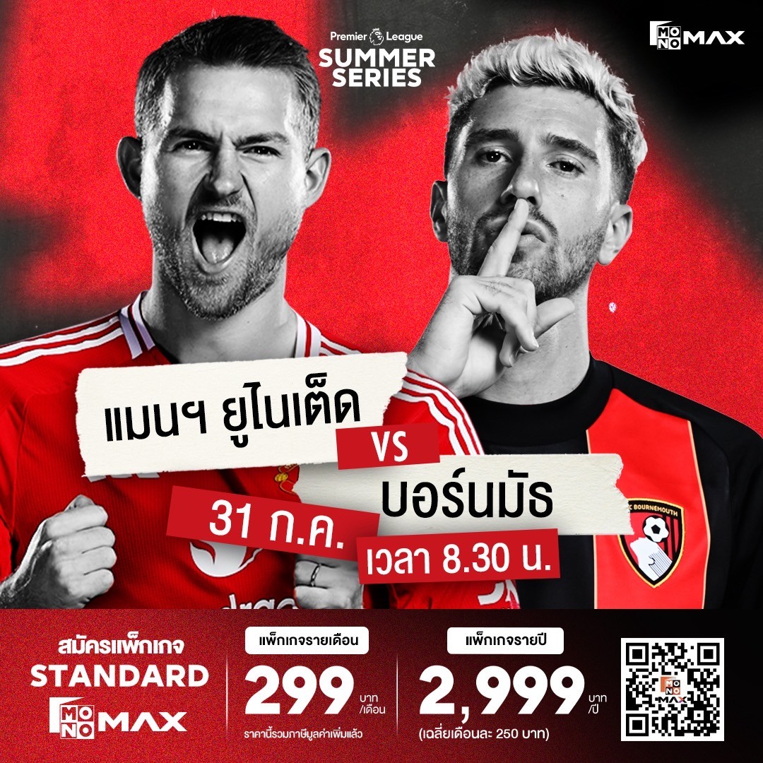 เตรียมพบกับความมันส่งท้ายเดือนกรกฎาคมนี้ บน Monomax แพลตฟอร์มหลักในการถ่ายทอดสดพรีเมียร์ลีกและเอมิเรตส์ เอฟเอคัพ กับแมตซ์พิเศษเชียร์ทีมถึง 2 คู่เด็ด ในวันพฤหัสบดีที่ 31 กรกฎาคม 2568 ที่จะพาทุกท่านไปสัมผัสบรรยากาศความดุเดือดจากสังเวียนลูกหนังที่สหรัฐอเมริกา กับการแข่งขันในรายการพิเศษ “Premier League Summer Series”
