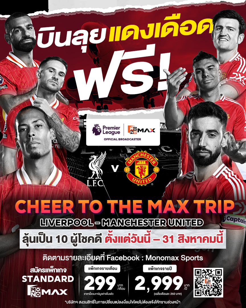 Monomax แพลตฟอร์มหลักในการถ่ายทอดสดฟุตบอลพรีเมียร์ลีกและเอมิเรตส์เอฟเอคัพตลอด 6 ฤดูกาล เดินหน้ามอบประสบการณ์เหนือระดับให้กับแฟนฟุตบอล กับกิจกรรมพิเศษ “CHEER TO THE MAX TRIP : VOL.1” สำหรับผู้ที่สมัครแพ็กเกจ Monomax Standard เท่านั้น!!! โดยการลุ้นรับสิทธิ์เดินทางไปชมการแข่งขันฟุตบอลพรีเมียร์ลีก อังกฤษ แบบชิดติดขอบสนาม ในแมตช์สุดยิ่งใหญ่ ลิเวอร์พูล พบ แมนเชสเตอร์ ยูไนเต็ด ณ สนามแอนฟิลด์ เมือง ลิเวอร์พูล ประเทศอังกฤษ ในวันเสาร์ที่ 18 ตุลาคมนี้!!!!