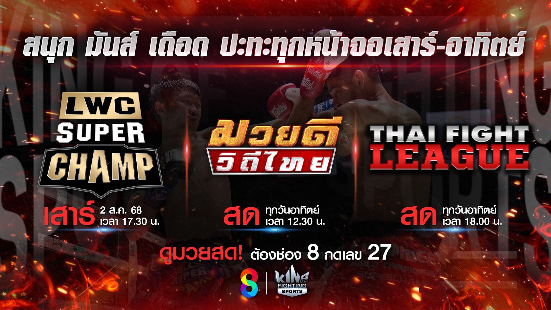 ดังนั้นห้ามพลาดชม 2 รายการมวยไทยสุดสัปดาห์ การันตีความมันที่สุดของประเทศ ใน วันอาทิตย์ที่ 3 สิงหาคม กับ รายการ มวยดีวิถีไทย เวลา 12.30 น. และ รายการ THAI FIGHT LEAGUE เวลา 18.00 น.ทางช่อง 8 กดเลข 27 ที่มีรายการมวยไทยมากที่สุด