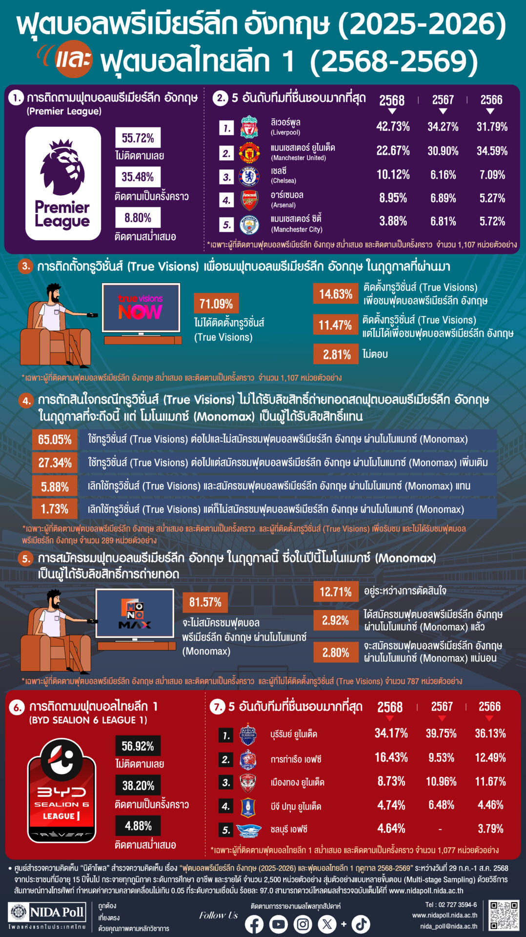 3 ส.ค. 2568 – ศูนย์สำรวจความคิดเห็น “นิด้าโพล” สถาบันบัณฑิตพัฒนบริหารศาสตร์ (นิด้า) เปิดเผยผลการสำรวจเรื่อง “ฟุตบอลพรีเมียร์ลีกอังกฤษ 2025-2026 และฟุตบอลไทยลีก 1 ฤดูกาล 2568-2569” ทำการสำรวจระหว่างวันที่ 29 กรกฎาคม – 1 สิงหาคม 2568 จากประชาชนที่มีอายุ 15 ปีขึ้นไป กระจายทุกภูมิภาค ระดับการศึกษา อาชีพ และรายได้ ทั่วประเทศ รวมจำนวนทั้งสิ้น 2,500 หน่วยตัวอย่าง เกี่ยวกับการติดตามฟุตบอลพรีเมียร์ลีก อังกฤษ