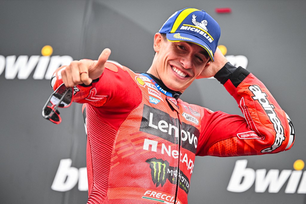 มาร์ค มาร์เกวซ นักบิดสังกัด ดูคาติ ฉลองชัยชนะครั้งแรกของอาชีพ ศึกจักรยานยนต์ทางเรียบ รุ่นโมโตจีพี รายการ ออสเตรียน กรังปรีซ์ ที่สนาม เรด บูลล์ ริง วันอาทิตย์ที่ 17 สิงหาคม