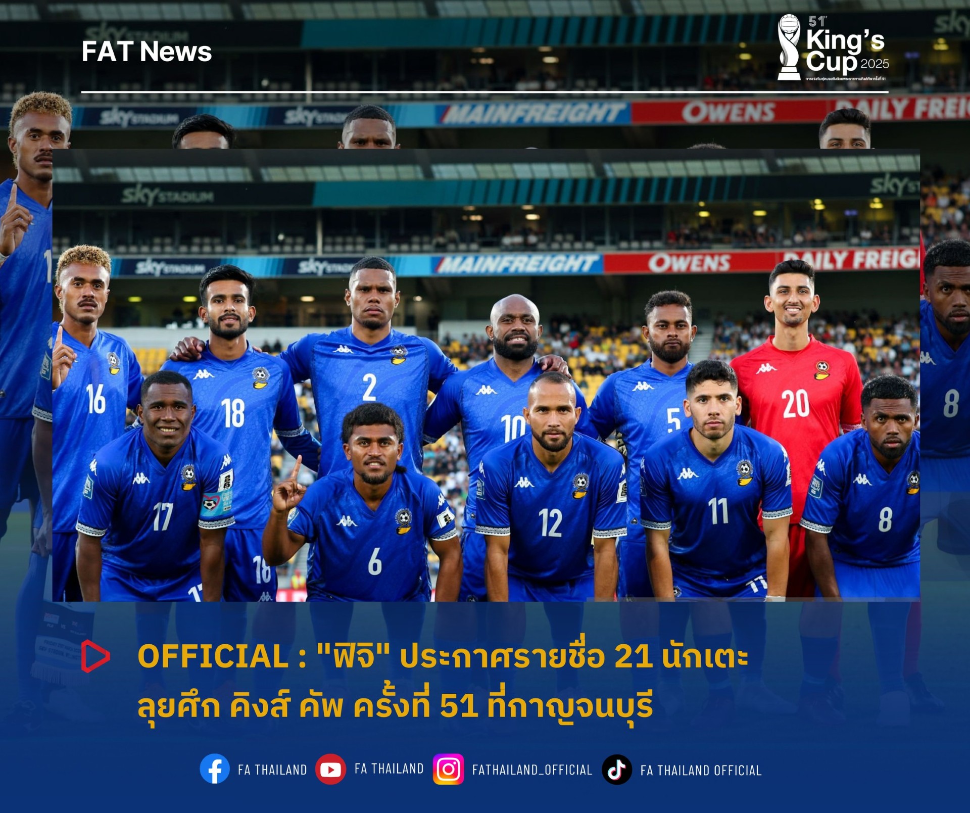 สมาคมฟุตบอลฟิจิ ประกาศรายชื่อ 21 นักฟุตบอลทีมชาติฟิจิ ชุดเข้าร่วมการแข่งขันฟุตบอลชิงถ้วยพระราชทาน คิงส์ คัพ ครั้งที่ 51 ณ จังหวัดกาญจนบุรี ระหว่างวันที่ 1-9 กันยายน 2568 ภายใต้การคุมทัพของ "ร็อบ เชอร์แมน" หัวหน้าผู้ฝึกสอน