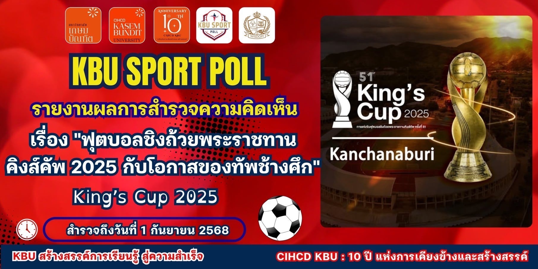 จากการที่สมาคมกีฬาฟุตบอลแห่งประเทศไทยจะจัดการแข่งขันฟุตบอลชิงถ้วยพระราชทานคิงส์คัพ ครั้งที่ 51ในวันที่ 4 และ 7 กันยายน 2568 ณ สนามกลีบบัว จังหวัดกาญจนบุรีโดยมีทีมเข้าร่วม 4 ชาติประกอบด้วย ทีมชาติไทย ทีมชาติอิรัก ทีมชาติฮ่องกง และทีมชาติฟิจินั้น เพื่อเป็นการสร้างการมีส่วนร่วมและสะท้อนมุมมองของแฟนกีฬาและประชาชนทั่วไปในมิติที่เกี่ยวกับโอกาสและความสำเร็จของทีมชาติไทย KBU SPORT POLLโดยศูนย์นวัตกรรมการพัฒนาทุนมนุษย์ มหาวิทยาลัยเกษมบัณฑิต ร่วมกับสถาบันการจัดการกีฬาเพื่อองค์กรกีฬา (WISDOM) จึงสำรวจคิดเห็นเรื่อง “ฟุตบอลชิงถ้วยพระราชทานคิงส์คัพ 2025 กับโอกาสของทัพช้างศึก”
