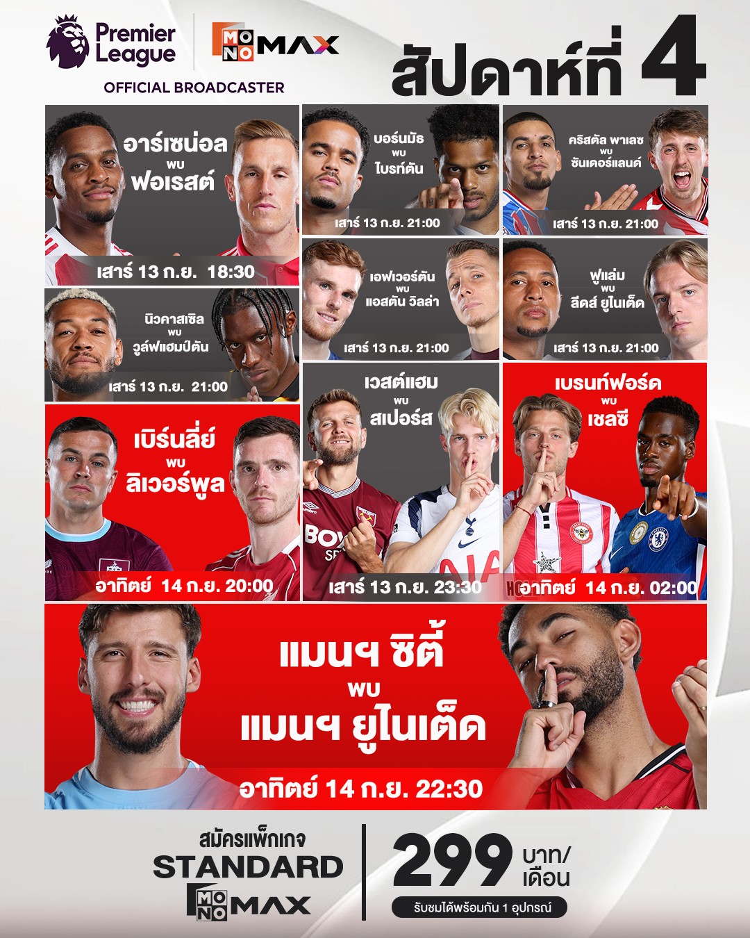 ส่วนโปรแกรม วันอาทิตย์ที่ 14 กันยายน เวลา 20.00 น. รับชมทาง Monomax เบิร์นลีย์ เปิดบ้านรับ ลิเวอร์พูล เกมที่หงส์แดงต้องการเก็บสามแต้มเพื่อเกาะกลุ่มนำ แต่เจ้าบ้านขึ้นชื่อเรื่องความแข็งแกร่งในถิ่นเทิร์ฟ มัวร์ ทำให้เกมนี้ไม่ง่ายแน่นอน และปิดท้ายสุดยิ่งใหญ่กับศึก “แมนเชสเตอร์ ดาร์บี้” เวลา 22.30 น. แมนเชสเตอร์ ซิตี้ ดวล แมนเชสเตอร์ ยูไนเต็ด เรือใบสีฟ้าในฐานะแชมป์เก่าเดินหน้าป้องกันศักดิ์ศรี ขณะที่ปีศาจแดงพร้อมลุยเต็มสูบเพื่อคว้าชัยเหนือคู่ปรับร่วมเมืองในเอติฮัด รับชมทาง Monomax