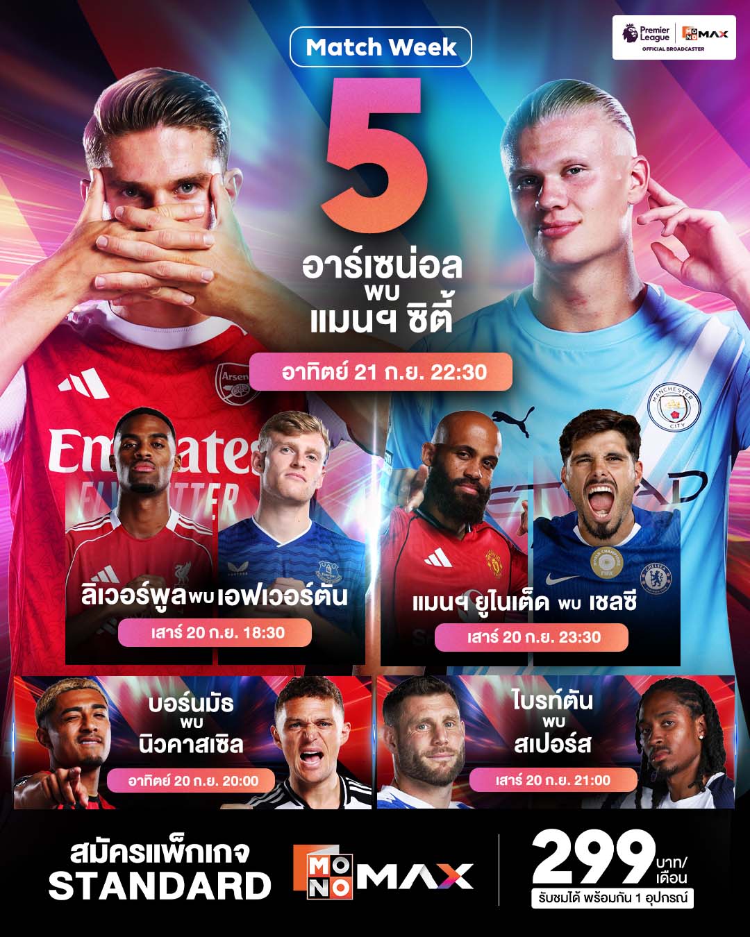 สำหรับโปรแกรม วันอาทิตย์ที่ 21 กันยายน เวลา 20.00 น. รับชมทาง Monomax บอร์นมัธ เปิดบ้านรับมือ นิวคาสเซิ่ล ยูไนเต็ด ขณะเดียวกัน ซันเดอร์แลนด์ น้องใหม่ไฟแรงเตรียมพิสูจน์ศักยภาพในลีกสูงสุดด้วยการเปิดถิ่นต้อนรับการมาเยือนของ แอสตัน วิลล่า และปิดท้ายสุดสัปดาห์ด้วยเกมซุปเปอร์บิ๊กแมตช์ในเวลา 22.30 น. ที่ทั่วโลกเฝ้าจับตามอง เมื่อ อาร์เซน่อล เปิดเอมิเรตส์สเตเดี้ยมดวลกับแชมป์เก่าอย่าง แมนเชสเตอร์ ซิตี้ เกมที่อาจชี้ชะตาการลุ้นบัลลังก์พรีเมียร์ลีกตั้งแต่ต้นฤดูกาล รับชมทาง Monomax