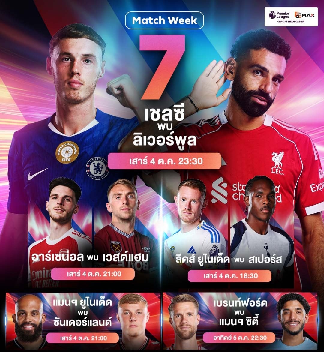 เปิดม่านกันตั้งแต่เช้ามืด วันเสาร์ที่ 4 ตุลาคม 2568 เวลา 02:00 น. (คืนวันศุกร์ที่ 3 ตุลาคม 2568) รับชมทาง Monomax กับ บอร์นมัธ เปิดบ้านรับมือ ฟูแล่ม ทั้งสองทีมต่างต้องการแต้มเพื่อขยับอันดับ ต่อเนื่องช่วงหัวค่ำ เวลา 18:30 น. ความมันส์ต่อเนื่องที่สนามเอลแลนด์ โร้ด ลีดส์ ยูไนเต็ด เปิดรังต้อนรับการมาเยือนของ ท็อตแน่ม ฮ็อตสเปอร์ ศึกนี้ยูงทองพร้อมสู้สุดใจ แต่ไก่เดือยทองกำลังลุ้นพื้นที่หัวตารางและมีทีเด็ดเกมรุกสุดอันตราย รับชมทาง Monomax