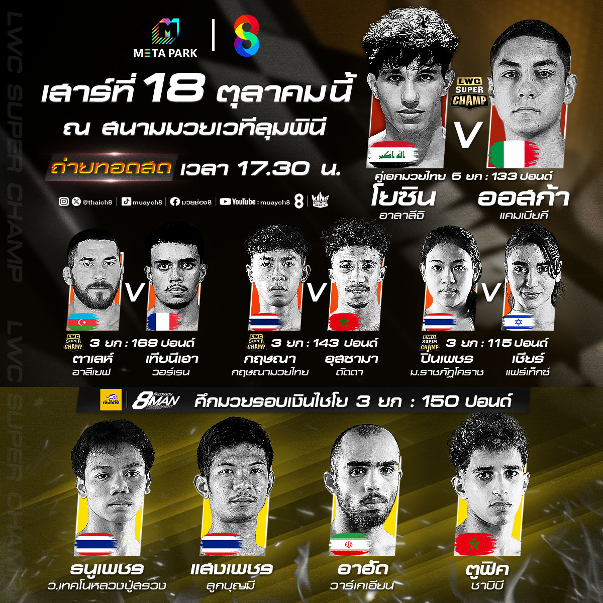 ดังนั้นแฟนมวยเตรียมปักหมุดเดือด ห้ามพลาดชม 3 รายการมวยไทยสุดสัปดาห์ การันตีความมันส์ที่สุดระดับประเทศ ในรายการ LWC SUPER CHAMP (ลุมพินีเวิลด์ แชมเปี้ยนชิพ ซุปเปอร์แชมป์) ในวันเสาร์ที่ 18 ตุลาคม เวลา 17.30 น. และ 2 รายการสุดมันส์ในวันอาทิตย์ที่ 19 ตุลาคม กับรายการ มวยดีวิถีไทย เวลา 12.30 น. และ รายการ THAI FIGHT LEAGUE เวลา 18.00 น. ทางช่อง 8 กดเลข 27 ที่มีรายการมวยไทยมากที่สุด!