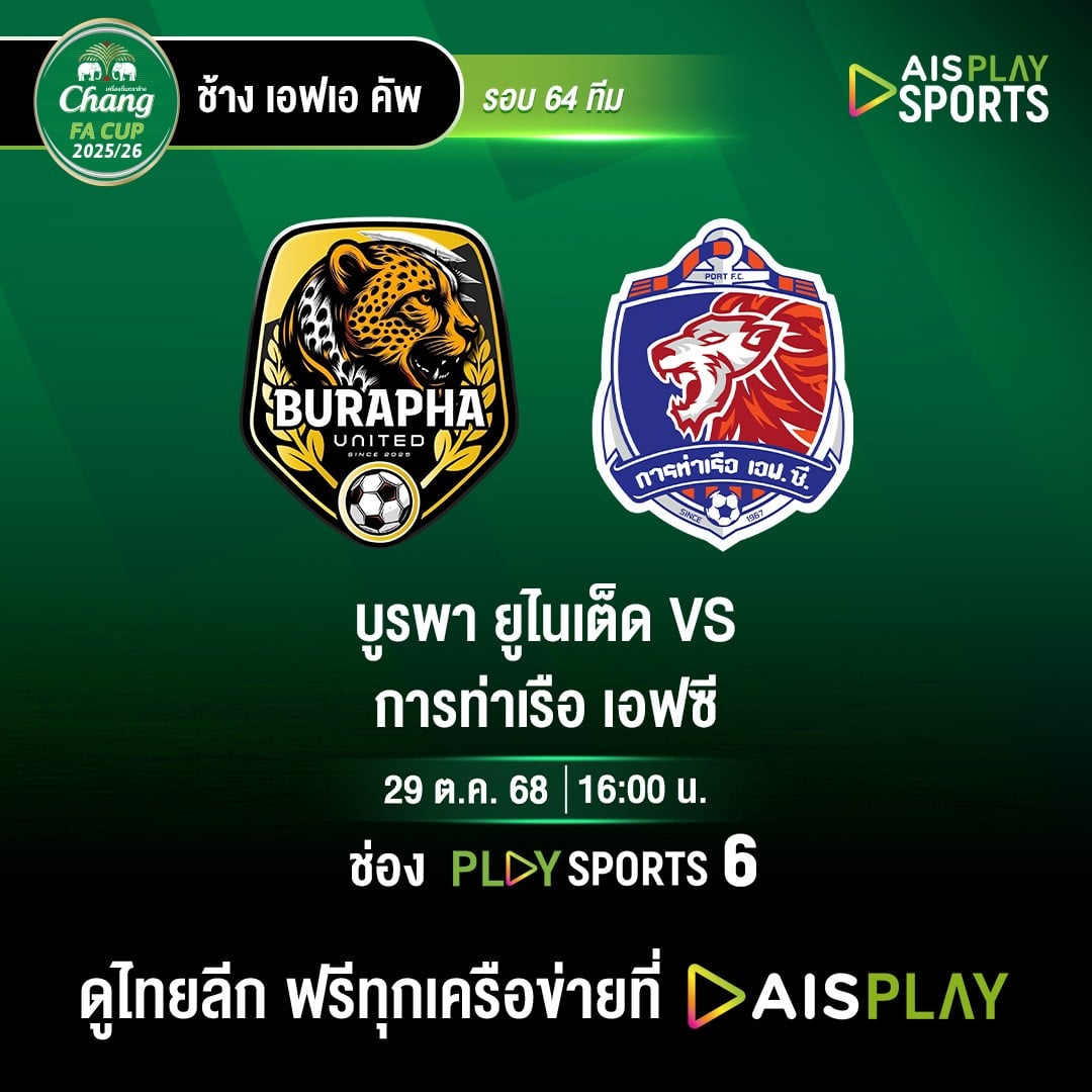ไฮไลท์ที่น่าสนใจในรอบ 64 ทีมสุดท้ายนี้ ไปกันที่บ้านบึง สเตเดียม “เสือบูรพา” บูรพา ยูไนเต็ด ทีมจ่าฝูงของ “บีวายดี ดอลฟินส์ ลีกสาม” โซนภาคตะวันออก จะเปิดบ้านรับการมาเยือนของ “สิงห์เจ้าท่า” การท่าเรือ เอฟซี ทีมดังจากลีกสูงสุด ในวันพุธที่ 29 ตุลาคม 2568 เวลา 16.00 น. ถ่ายทอดสดทาง AIS PLAY SPORTS6