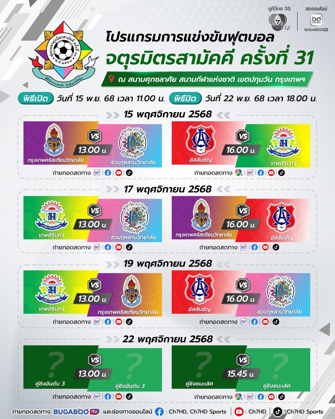 แฟนกีฬาวอร์มคอรอเชียร์ “ช่อง 7HD” ถ่ายทอดสดการแข่งขัน “ฟุตบอลจตุรมิตรสามัคคี ครั้งที่ 31” ของ 4 สถาบัน “รร.กรุงเทพคริสเตียนวิทยาลัย-รร.สวนกุหลาบวิทยาลัย-รร.อัสสัมชัญ- รร.เทพศิรินทร์” ส่งตรงความยิ่งใหญ่พิธีเปิดจากสนามศุภชลาศัย พร้อมระเบิดความมันนัดแรก เจอกัน ! วันเสาร์ที่ 15 พฤศจิกายนนี้