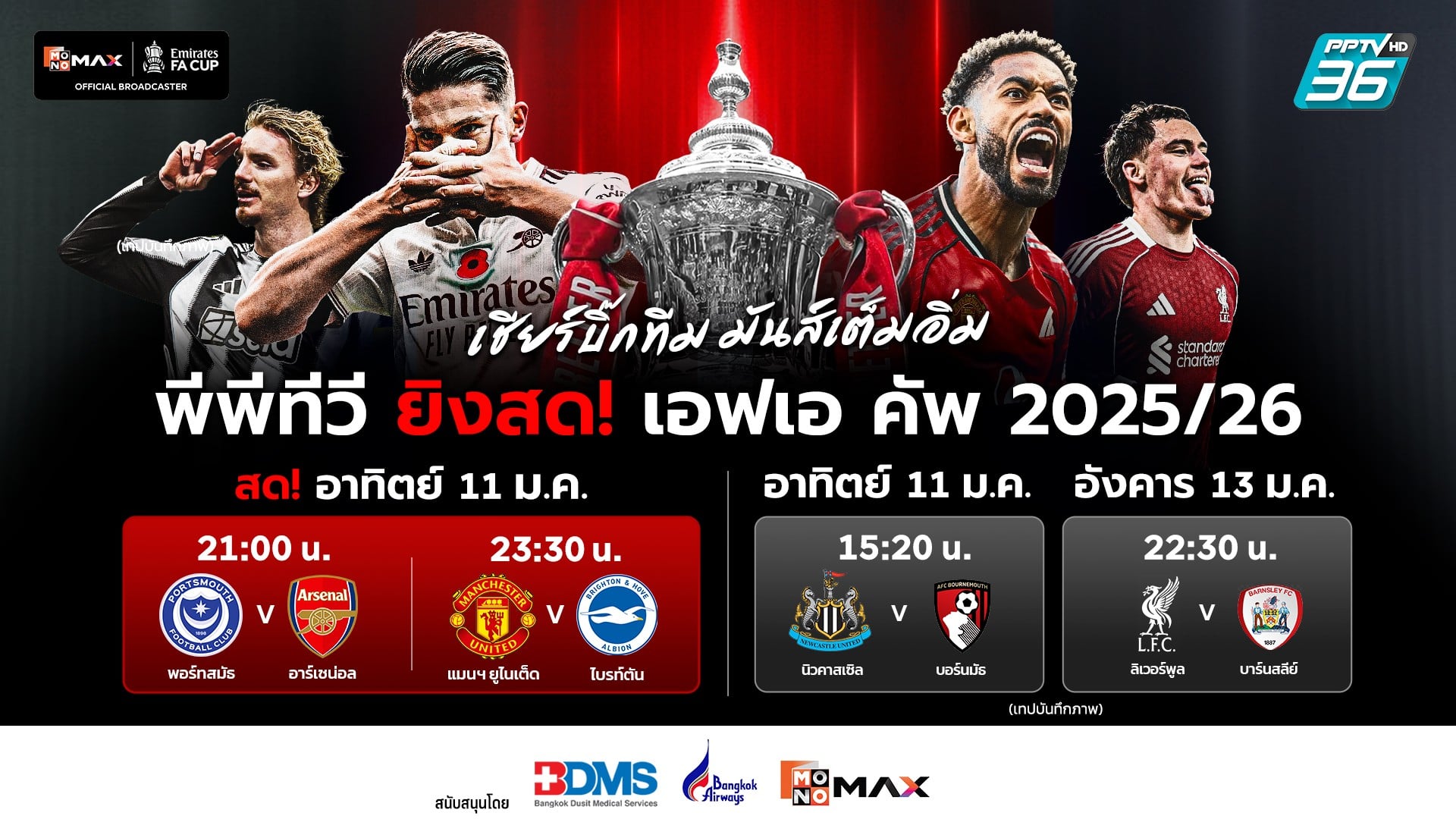 พีพีทีวี เอชดี ช่อง 36 เปิดศักราชใหม่จัดความมันส์ถล่มหน้าจอแฟนบอลตั้งแต่ต้นปี กับการถ่ายทอดสดศึกฟุตบอลถ้วยที่เก่าแก่ที่สุดของโลก “เอฟเอ คัพ 2025/26” ครบทุกอารมณ์ความเดือด ให้แฟนบอลได้ร่วมเชียร์สะใจไปกับบรรดาบิ๊กทีมจากพรีเมียร์ ลีก แบบจุใจการแข่งขัน ประเดิมความมันส์ตั้งแต่รอบ 3 ในวันอาทิตย์ที่ 11 มกราคม นี้ ชมเกมมันส์แพ็คคู่ เริ่มเวลา 21.00 น. พอร์ทสมัธ ปะทะ อาร์เซนอล ก่อนจะต่อด้วยคู่บิ๊กแมตช์ เวลา 23.30 น. แมนเชสเตอร์ ยูไนเต็ด ดวล ไบรท์ตัน