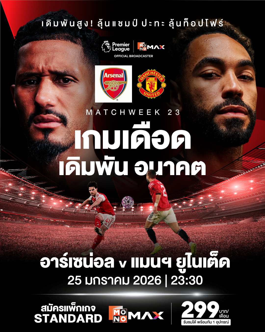 ก่อนต่อยอดความมันส์ด้วยเกมคุณภาพ นิวคาสเซิล ยูไนเต็ด พบ แอสตัน วิลลา สองทีมฟอร์มแรงที่มีลุ้นพื้นที่หัวตาราง และปิดท้ายคืนวันอาทิตย์แบบเดือดสุดขีดใน เวลา 23.30 น. Monomax ยิงสดกับ บิ๊กแมตช์ประจำสัปดาห์ อาร์เซนอล พบ แมนเชสเตอร์ ยูไนเต็ด ศึกแห่งศักดิ์ศรีที่มากกว่าสามแต้ม การพบกันของสองทีมยักษ์ใหญ่ที่อยู่ในกลุ่มหัวตาราง อาร์เซนอลต้องการสามแต้มเพื่อยึดตำแหน่งหัวตารางอย่างเหนียวแน่น ขณะที่แมนเชสเตอร์ ยูไนเต็ด ต้องการผลการแข่งขันที่ดีเพื่อรักษาเส้นทางลุ้นแชมป์ เกมนี้จึงเต็มไปด้วยแรงกดดันและความเข้มข้นทุกจังหวะ แฟนบอลเตรียมลุ้นทุกจังหวะจนถึงเสียงนกหวีดสุดท้าย