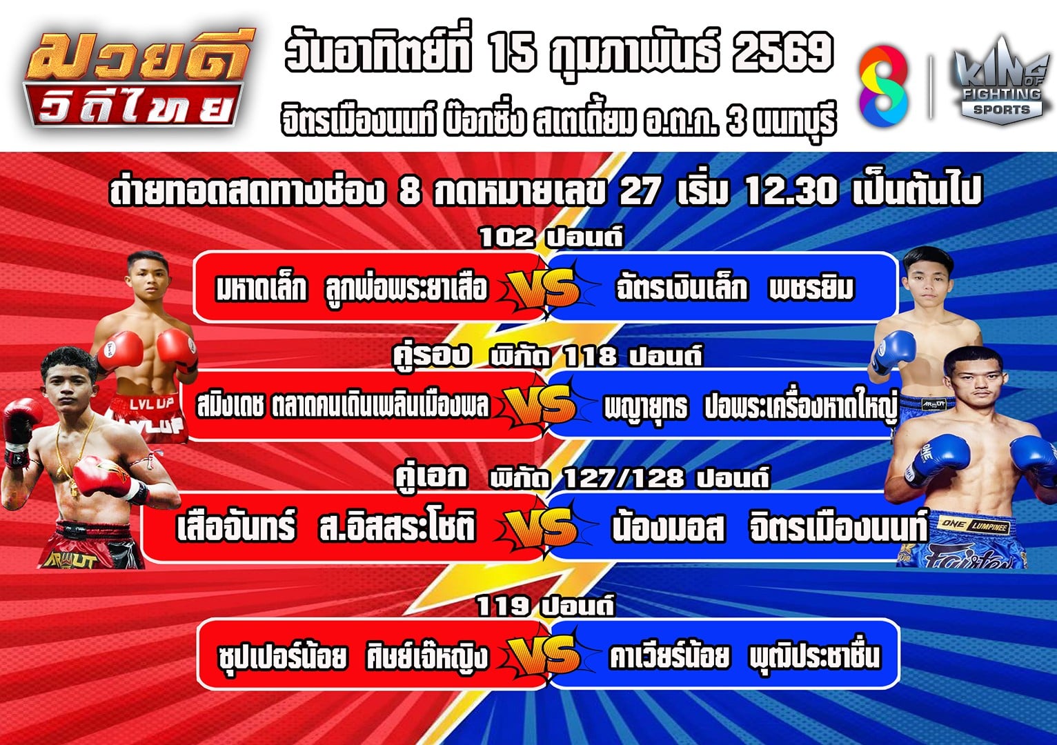 สัปดาห์นี้ คู่เอกจัดให้ “เสือจันทร์ ส.อิสสระโชติ” ขุนพลเมืองสะเดา ต่อน้ำหนัก 1 ปอนด์ พบกับ “น้องมอส จิตรเมืองนนท์” ซ้ายสะเทือนทุ่ง ในพิกัด 127 / 128 ปอนด์ ส่วนรองคู่เอก “สมิงเดช ตลาดคนเดินเพลินเมืองพล” นักรบเมืองพระยาแล พบ “พญายุทธ ปอหาดใหญ่พระเครื่อง” นักบู๊พันธ์แกร่ง พิกัด 118 ปอนด์ และมันส์กันอีกกับคู่มหากาฬอีก 2 คู่ “มหาดเล็ก ลูกพ่อพระยาเสือ” พบ “ฉัตรเงินเล็ก พชรยิม พิกัด 102 ปอนด์ และ “ซุปเปอร์น้อย ศิษย์เจ๊หญิง” พบ “คาเวียร์น้อย พุฒิประชาชื่น” พิกัด 119 ปอนด์