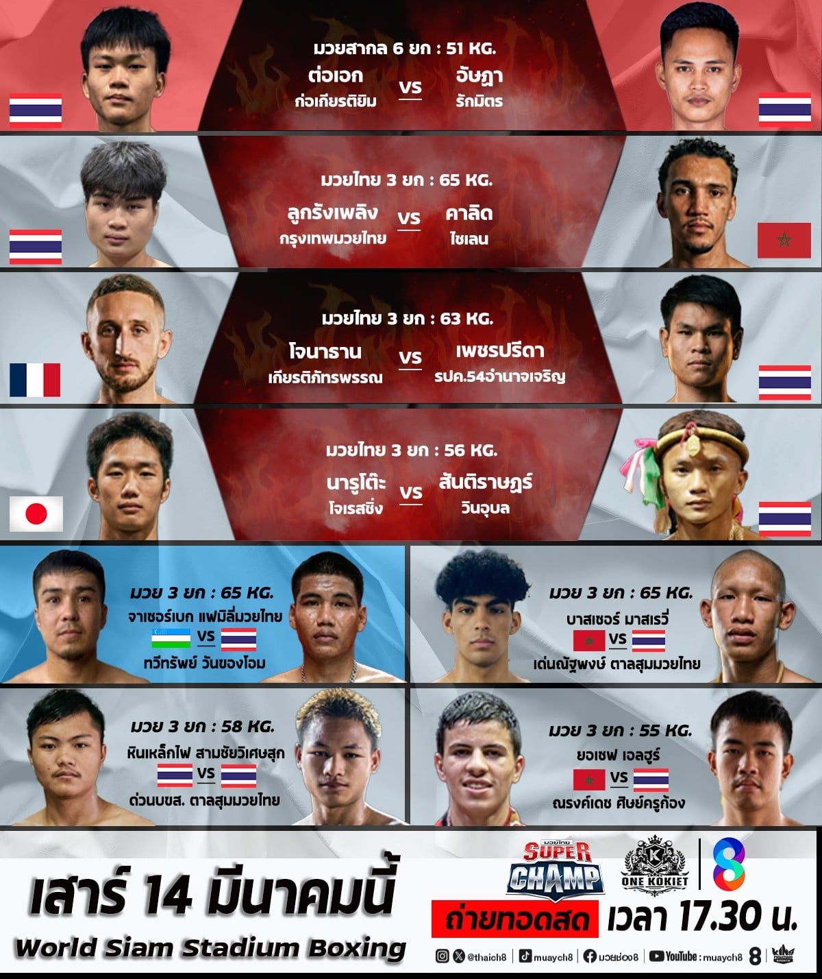 รายการ มวยไทย Super Champ ถ่ายทอดสดจาก เวทีมวย WORLD SIAM STADIUM ตะวันนา บางกะปิ พบกับความสนุกเร้าใจแบบถึงขั้ว ด้วยนักชกพันธุ์แกร่งทั้งไทยและต่างชาติ คู่เอก เป็นการพบกัน พิกัด 65 กก. ระหว่าง “จาเซอร์เบก แฟมิลี่มวยไทย” อูซเบกสายโหด พบ “ทวีทรัพย์ วันของโอม” ขุนศอกกระหายเลือด พร้อมด้วยคู่มวยประกอบรายการสุดระทึก