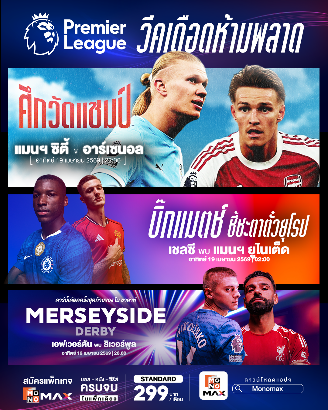 จากนั้นช่วงค่ำ วันอาทิตย์ที่ 19 เมษายน 2569 เวลา 20.00 น. Monomax ยิงสดพร้อมกันสามสนามเริ่มจาก แอสตัน วิลล่า พบ ซันเดอร์แลนด์ เจ้าบ้านหวังเก็บแต้มรักษาโมเมนตัม ขณะที่ทีมเยือนต้องการคะแนนหนีโซนอันตราย ต่อด้วยน็อตติ้งแฮม ฟอเรสต์ พบ เบิร์นลีย์ เกมสำคัญของทีมกลางตารางที่ทุกคะแนนมีความหมาย และ เมอร์ซีย์ไซด์ดาร์บี้ เอฟเวอร์ตัน เปิดบ้านรับ ลิเวอร์พูล ศึกแห่งศักดิ์ศรีเมืองลิเวอร์พูลที่มักเต็มไปด้วยความดุดัน เข้มข้น ใครอยากชมคู่นี้ริมหาดจอยักษ์ แบบมันส์ สะใจ สามารถตามไปพบกันได้ที่ “สงกรานต์ พัทยา Watch Party on the Beach” ในวันอาทิตย์ที่ 19 เมษายน 2569 ณ ชายหาดพัทยา