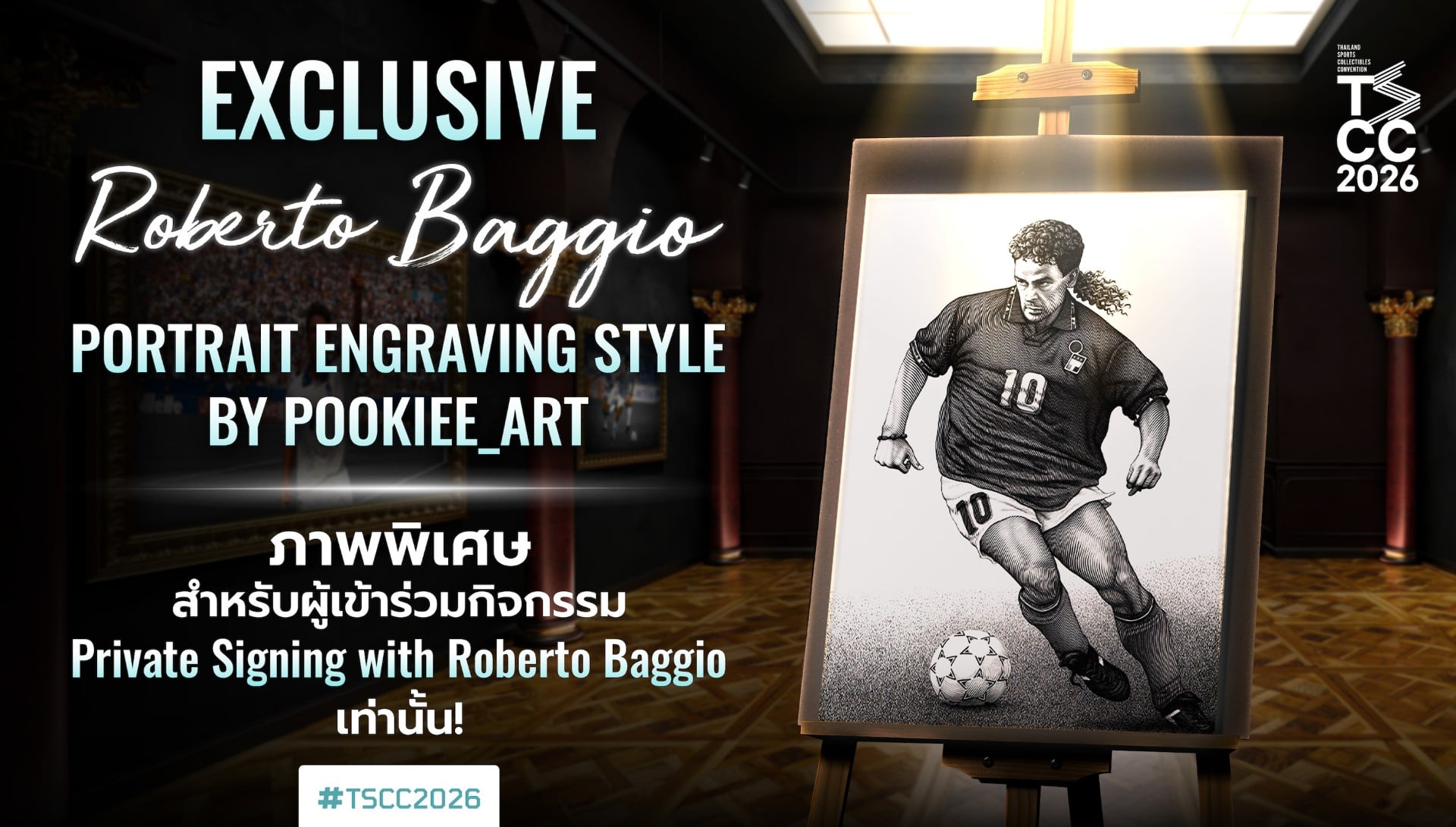 เตรียมพบกับผลงานศิลปะสุดพิเศษที่ไม่เหมือนใคร! งาน TSCC 2026 เปิดตัวอย่างเป็นทางการกับผลงาน A2 Limited Edition สุดเอกซ์คลูซีฟ ที่สร้างสรรค์ขึ้นเป็นพิเศษสำหรับกิจกรรม Private Signing with Roberto Baggio เท่านั้น โดยผลงานชิ้นนี้รังสรรค์โดย Pookiee_Art ศิลปินผู้มีชื่อเสียงในแวดวงฟุตบอล จากผลงานอันโดดเด่นอย่างภาพของ Dennis Bergkamp บนธนบัตรประเทศเนเธอร์แลนด์