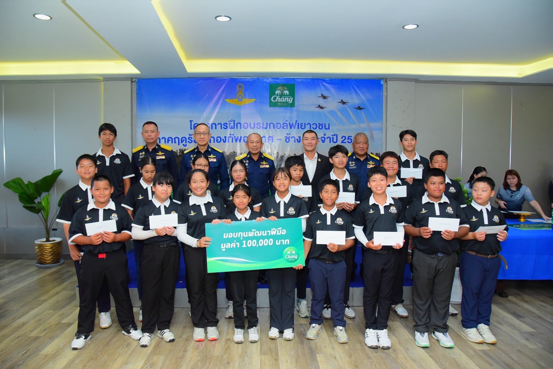 สำหรับโครงการฝึกอบรมกอล์ฟเยาวชนภาคฤดูร้อน “ช้าง - กองทัพอากาศ” ประจำปี 2569 ในปีนี้ ถือว่าประสบความสำเร็จเป็นอย่างมาก โดยมีน้อง ๆ นักกอล์ฟเยาวชนเข้าร่วมอบรมทั้งสิ้น 200 คน เราได้เห็นน้อง ๆ หลายคนมีพัฒนาการด้านกีฬากอล์ฟที่เติบโตแบบก้าวกระโดด แสดงให้เห็นถึงความเข้มข้นของหลักสูตรต่าง ๆ ความทุ่มเทของผู้ฝึกสอน และความมุ่งมั่นตั้งใจของน้อง ๆ ที่เข้าร่วมอบรม “น้ำแร่ธรรมชาติตราช้าง” จึงขอมอบทุนพัฒนาฝีมือ จำนวน 20 ทุน ทุนละ 5,000 บาท รวมทั้งสิ้น 100,000 บาท เพื่อให้น้อง ๆ นำไปต่อยอดในการเรียนรู้ ฝึกซ้อมและพัฒนาตนเองอย่างต่อเนื่อง เพื่อก้าวสู่การเป็นโปรกอล์ฟในอนาคต