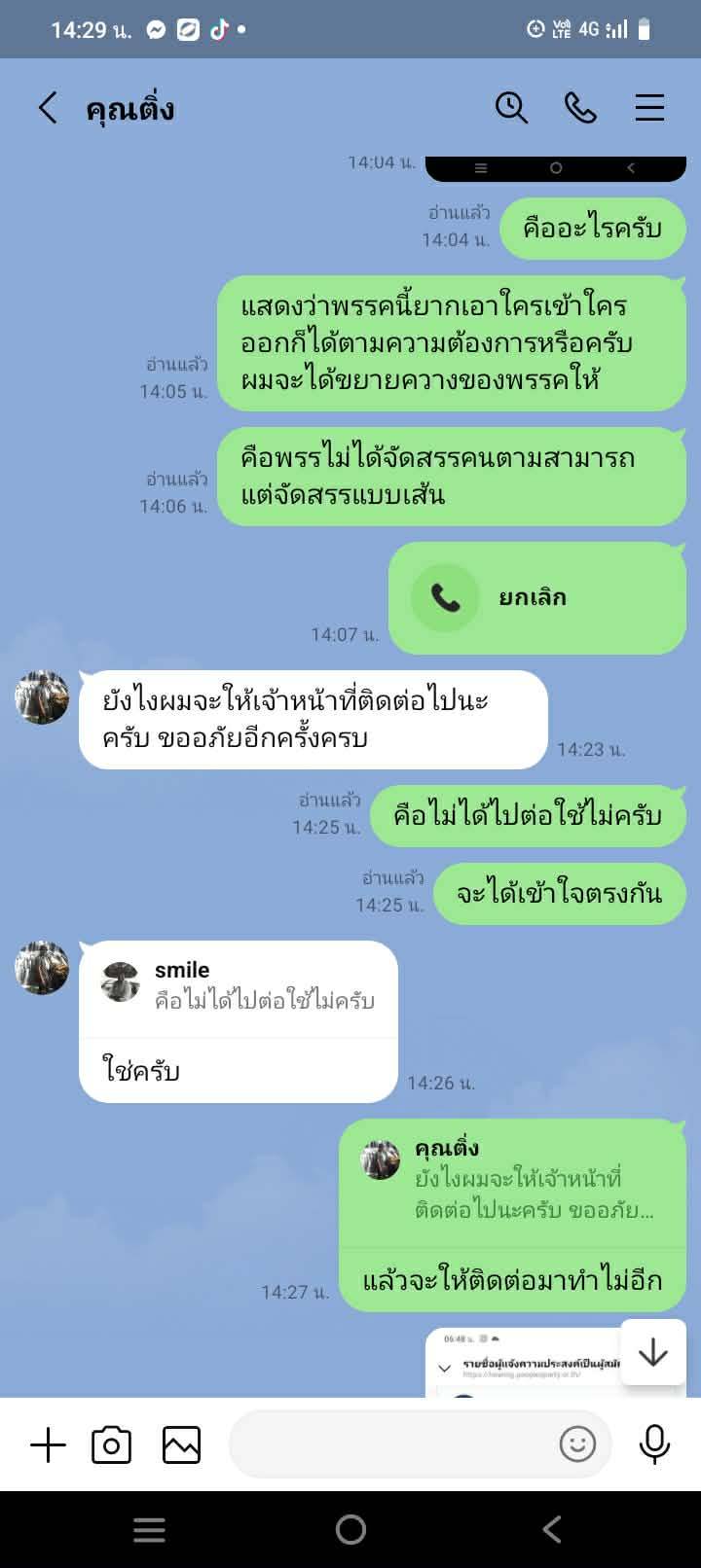 ต่อมา นายสมชายได้ขอแอดไลน์เพื่อติดต่อสอบถามเพิ่มเติม โดยตั้งคำถามว่า พรรคสามารถคัดเลือกหรือถอดชื่อบุคคลได้ตามความต้องการหรือไม่ และการจัดสรรผู้สมัครเป็นไปตามความสามารถหรือเส้นสาย อย่างไรก็ตาม บุคคลดังกล่าวไม่ได้ตอบคำถาม และแจ้งว่าจะให้เจ้าหน้าที่ติดต่อกลับ แต่ไม่มีการติดต่อใดๆ เพิ่มเติม