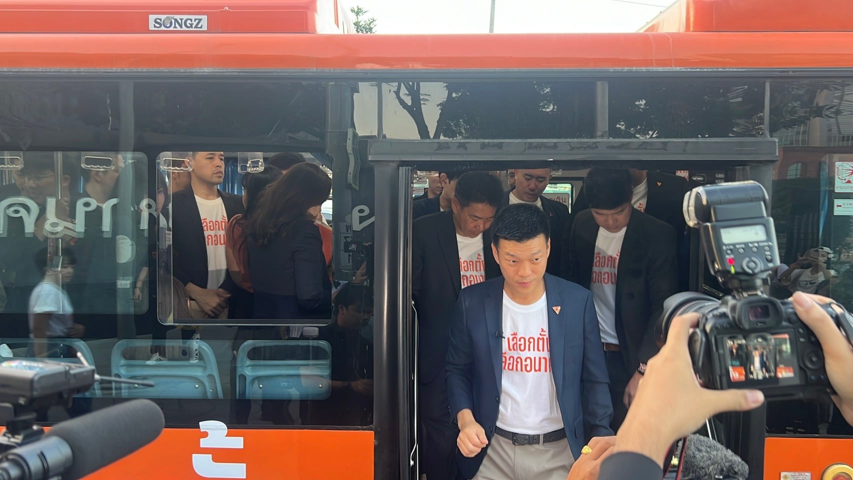 27 ธันวาคม 2568 - นายณัฐพงษ์ เรืองปัญญาวุฒิ หรือ “เท้ง” หัวหน้าพรรคประชาชน นำทีมผู้สมัครสมาชิกสภาผู้แทนราษฎร (สส.) กรุงเทพมหานคร ทั้ง 33 เขต เดินทางด้วยรถโดยสารพลังงานไฟฟ้าสีส้ม สกรีนข้อความ “เลือกตั้ง เลือกอนาคต” จากอาคารไทยซัมมิท ทาวเวอร์ มายังอาคารกีฬาเวสน์ 2 ศูนย์เยาวชนกรุงเทพมหานคร ไทย-ญี่ปุ่น เขตดินแดง เพื่อสมัครรับเลือกตั้ง สส.แบบแบ่งเขต ในวันแรกของการรับสมัคร