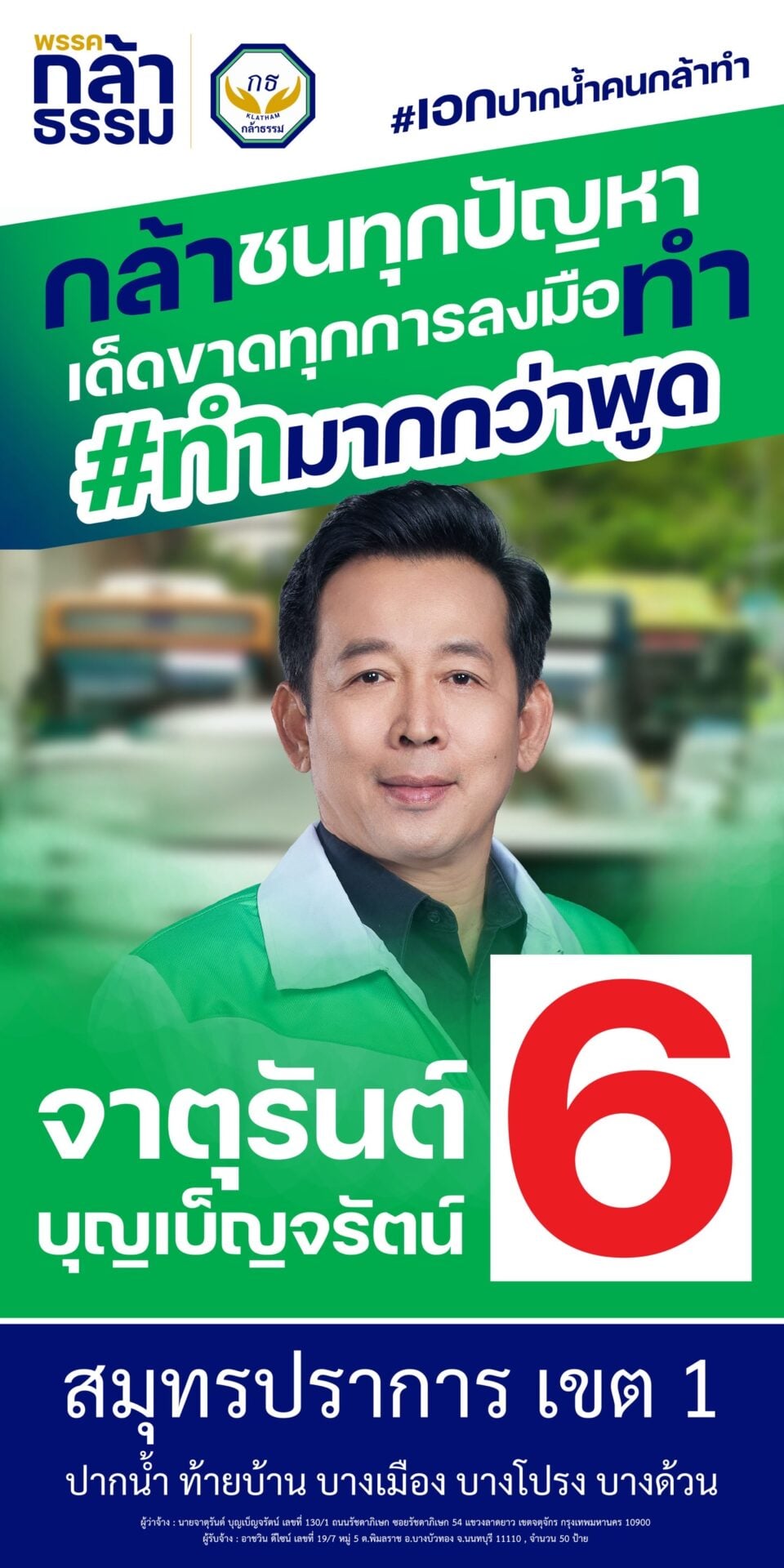 “ชาวสมุทรปราการ เขต 1 ต้องการผู้แทนที่พร้อมสู้กับปัญหาและรับผิดชอบต่อผลลัพธ์ ผมขออาสาเข้ามาทำหน้าที่ สส. ที่ทำงานให้เห็นจริง” นายจาตุรันต์ กล่าว.