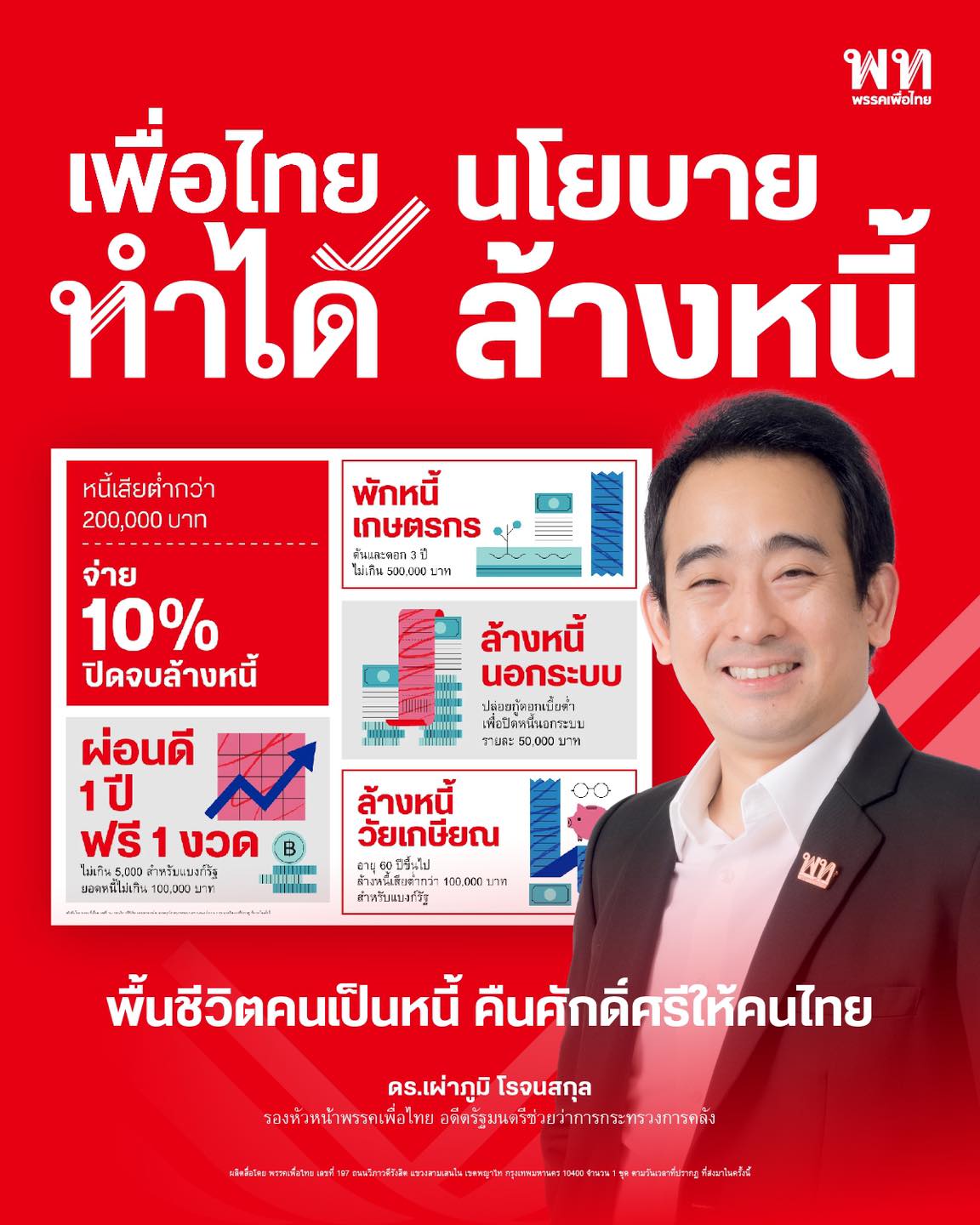 30 ธ.ค. 2568 – นายเผ่าภูมิ โรจนสกุล รองหัวหน้าพรรคเพื่อไทย อดีตรัฐมนตรีช่วยว่าการกระทรวงการคลัง ให้สัมภาษณ์ถึงรายละเอียดนโยบายล้างหนี้ของพรรคเพื่อไทยว่า แพคเกจล้างหนี้ของพรรคเพื่อไทย เป็นนโยบายครั้งเดียวจบ ฟื้นคืนชีวิตให้คนเป็นหนี้ คืนศักดิ์ศรีให้ประชาชนคนไทย โดยมีรายละเอียดนโยบาย ดังนี้