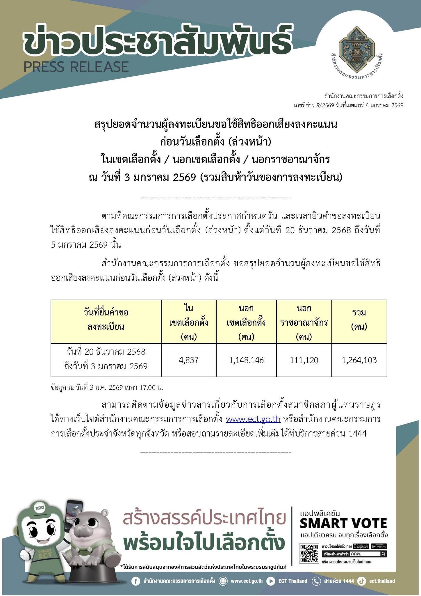 "กกต." สรุป 15 วัน ลงทะเบียนเลือกตั้งล่วงหน้า-นอกราชอาณาจักร 1,264,103 คน