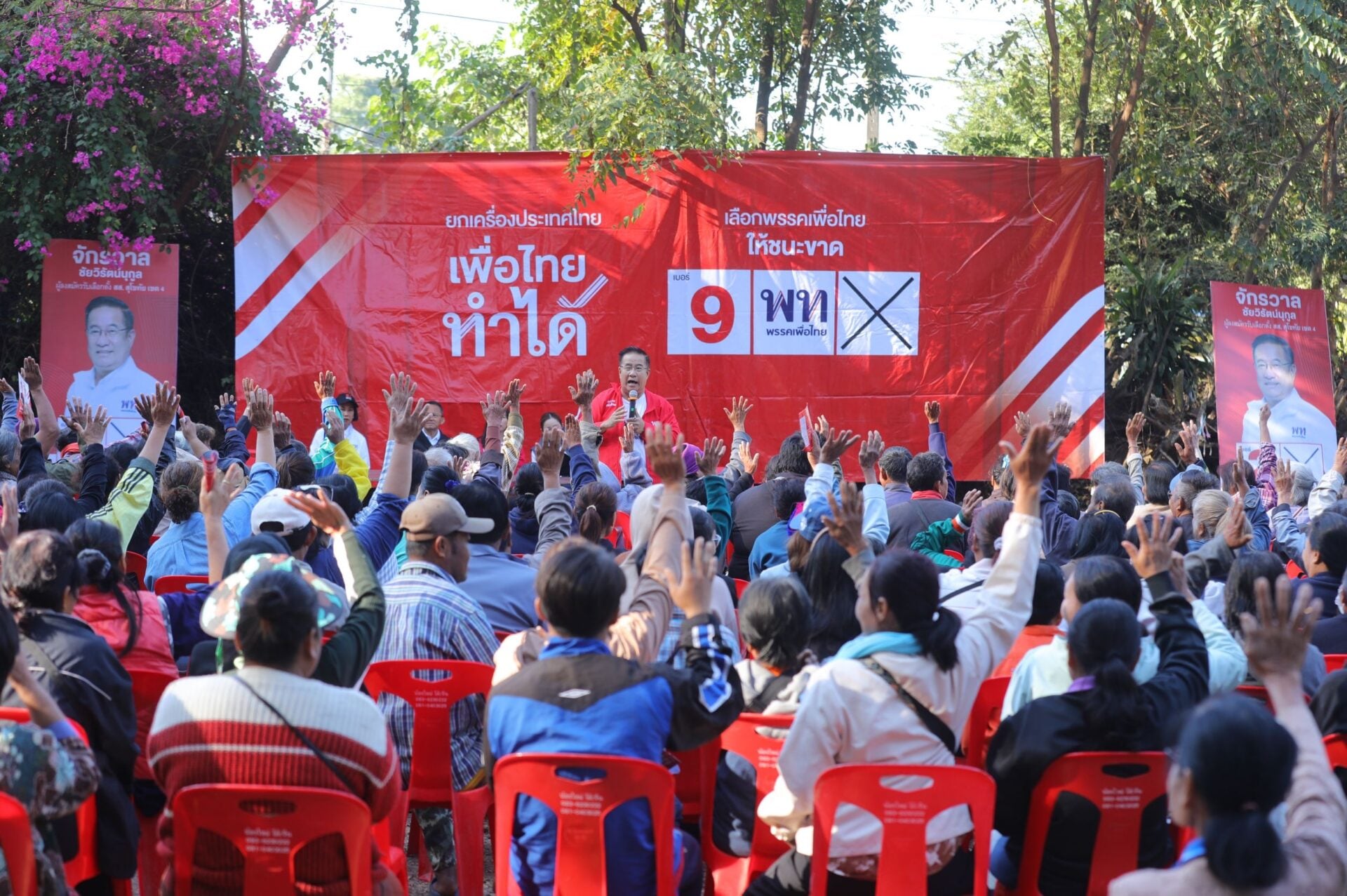 โดยนายสมศักดิ์ กล่าวว่า วันนี้ ตนพร้อมผู้สมัคร ทั้ง นายจักรวาล เขต 4 น.ส.ณัคนางค์ เขต 1 และ น.ส.ประภาพร เขต 3 มาช่วยกันนำเสนอนโยบายให้กับพี่น้องประชาชน เพราะการเลือกตั้งครั้งนี้ พรรคเพื่อไทย มีนโยบายจำนวนมาก ที่จะช่วยยกระดับคุณภาพชีวิตให้กับพี่น้องประชาชน อย่าง ในเขตเลือกตั้งที่ 4 พี่น้องประชาชนส่วนใหญ่ ประกอบอาชีพเกษตรกร พรรคเพื่อไทย ก็มีนโยบายประกันกำไรพืชผลการเกษตร 30% รวมถึงมีนโยบายแก้ไข พ.ร.บ.อ้อยและน้ำตาลทราย เพื่อเพิ่มการแบ่งผลประโยชน์ให้ชาวไร่อ้อย ได้มากกว่า 70% โดยการจะผลักดันแก้กฎหมาย ก็ต้องมีเสียงข้างมากในสภาฯ ดังนั้น พี่น้องประชาชน ก็ต้องช่วยกันสนับสนุนเลือกนายจักรวาล เบอร์ 2 เข้าสภาฯไปช่วยแก้กฎหมายให้พี่น้องเกษตรกรด้วย
