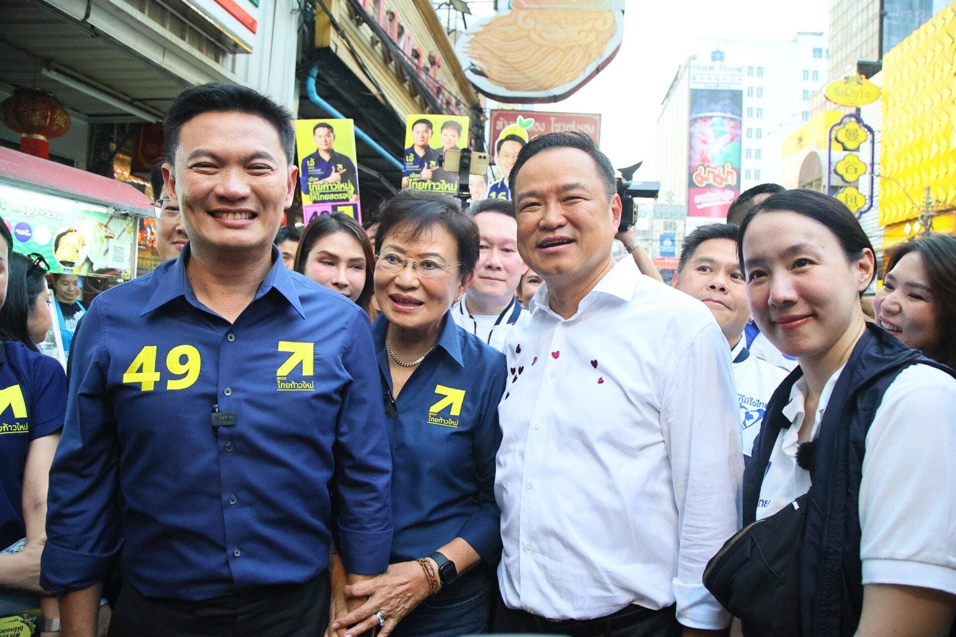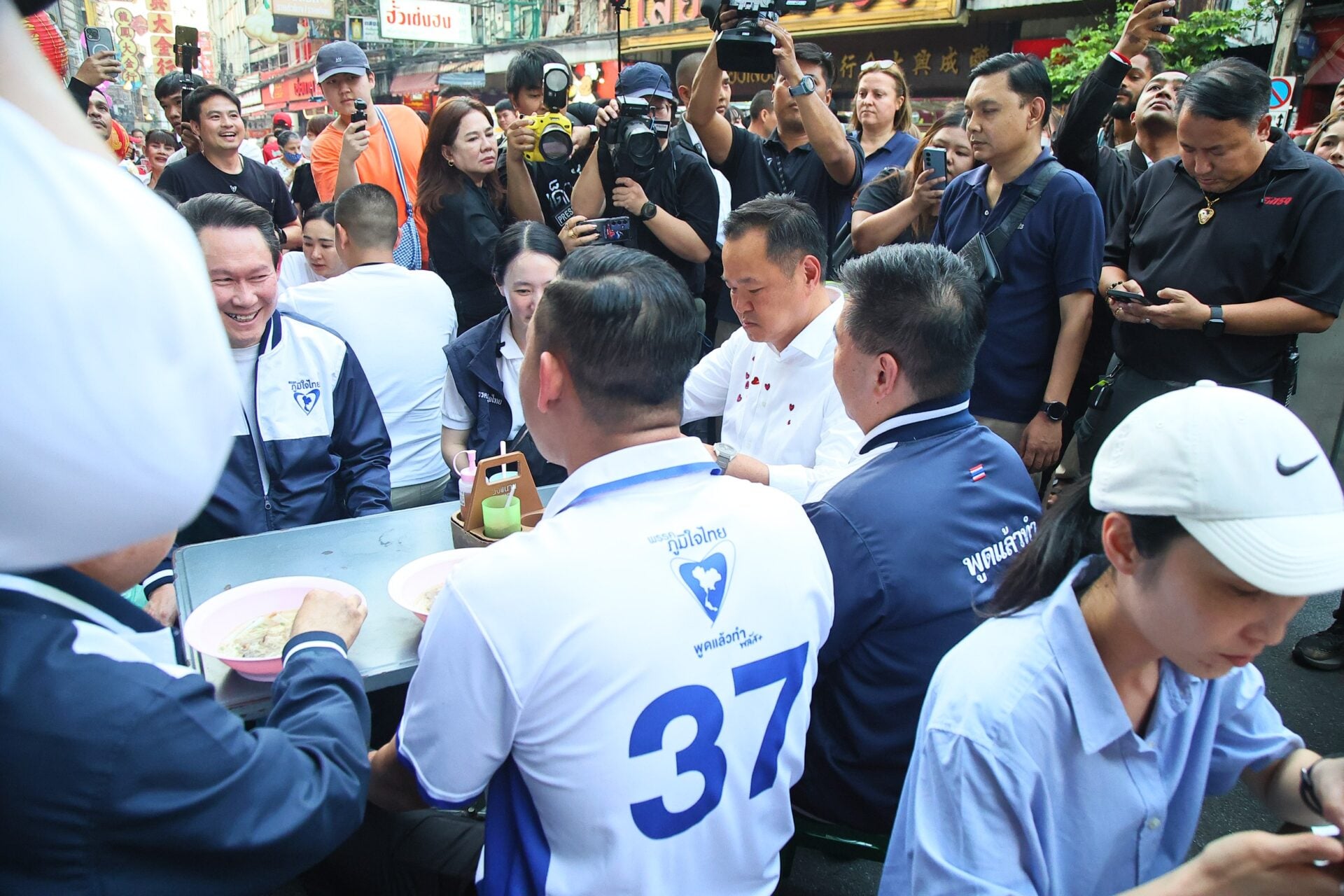 ผู้สื่อข่าวรายงานอีกว่าระหว่างเดินหาเสียงมาถึงถนนเยาวราชปรากฏว่าเป็นจังหวะที่นายสุชัชวีร์ สุวรรณสวัสดิ์ หัวหน้าพรรคไทยก้าวใหม่ และทีมงานเดินหาเสียงอยู่ถนนฝั่งตรงข้าม เมื่อนายอนุทินเห็น จึงตะโกนเรียกว่า “พี่เอ้ๆ” ซึ่งทำให้นายสุชัชวีร์ หันมายิ้มพร้อมกับโบกมือทักทายกลับ และพาคณะเดินข้ามถนนมาหานายอนุทิน